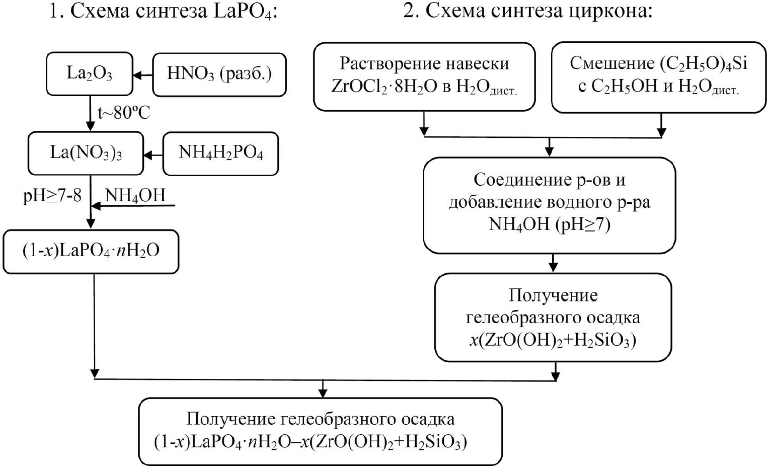 Для синтеза наноразмерных порошков-прекурсоров (1-х)LaPO4·nH2O–x(H2SiO3–ZrO(OH)2), где мольная доля х = 0.0, 0.2, 0.3, 0.4, 0.5, 0.7, 0.9 и 1.0, в качестве исходных веществ были взяты оксид лантана La2O3, оксихлорид циркония ZrOCl2·8H2O, тетраэтоксисилан (ТЭОС, С2Н5О)4Si), однозамещенный фосфат аммония (NH4H2PO4), разбавленная азотная кислота (1:1); водный раствор аммиака, все марки «осч»; этиловый спирт; дистиллированная вода. Реакционная схема синтеза представлена на рис. 1.