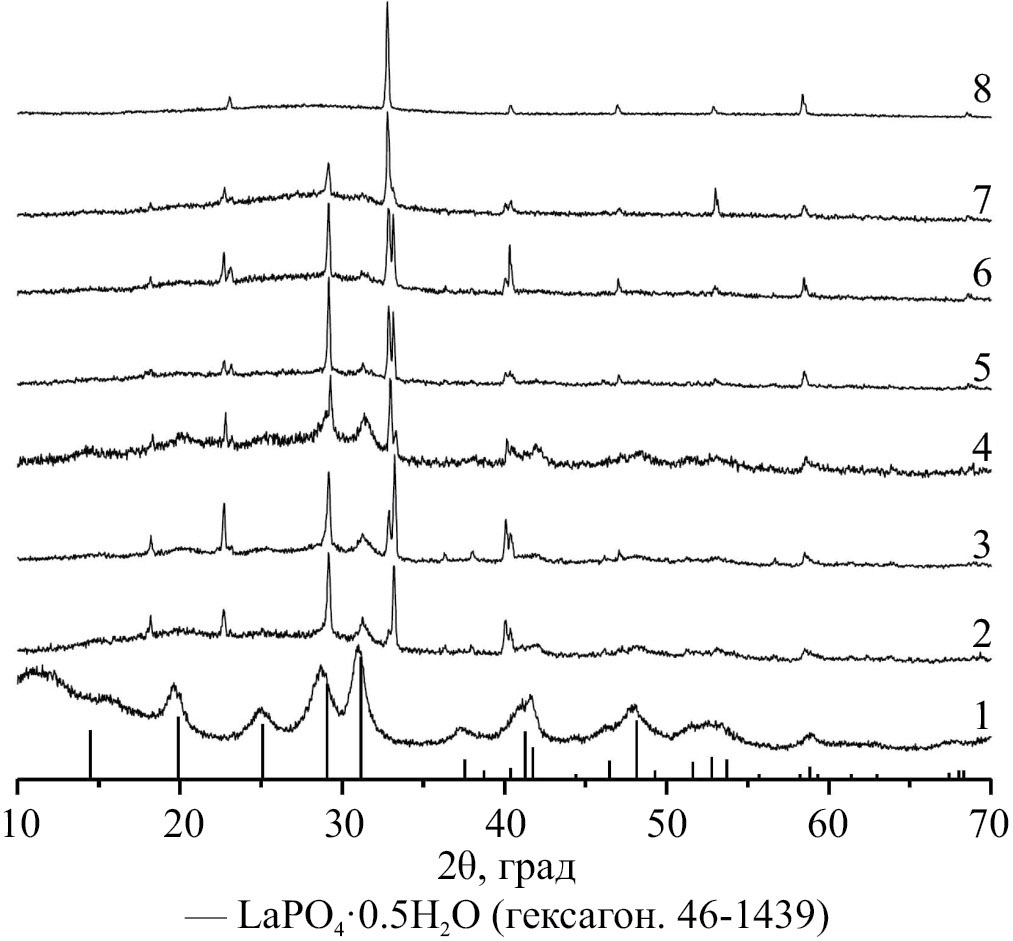 Результаты РФА исходных порошков (1–х)LaPO4·nH2O–х(ZrO(OH)2+H2SiO3) приведены на рис. 2. Представленные рентгеновские дифрактограммы показывают, что промежуточные композиции (рис. 2, дифрактограммы 2–7) представляют собой смесь гексагонального LaPO4·nH2O, закристаллизованной кремневой кислоты H2SiO3 и рентгеноаморфного ZrO(OH)2. Рефлексы на рентгеновских дифрактограммах (2–8) совпадают с рефлексами, отнесенными к H2SiO3 в работе [21].