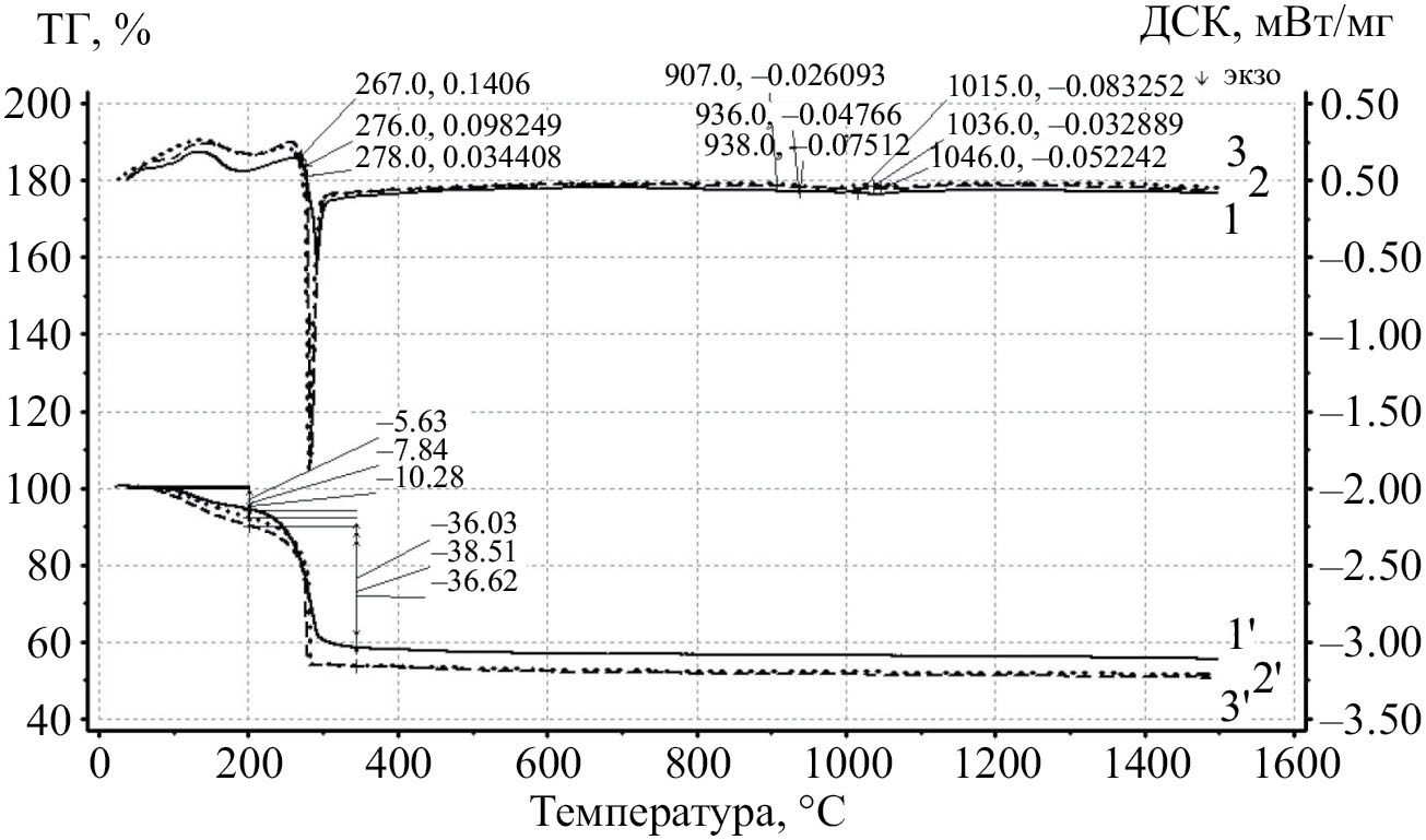Рис. 3. Кривые ДСК порошков-прекурсоров ((1–х)LaPO4·nH2O–х(ZrO(OH)2–H2SiO3) для х = 0.2 (кривая 1, сплошная), 0.5 (кривая 2, штриховая,) и 0.9 (кривая 3, пунктирная), и соответствующие им кривые ТГ (1', 2', 3')