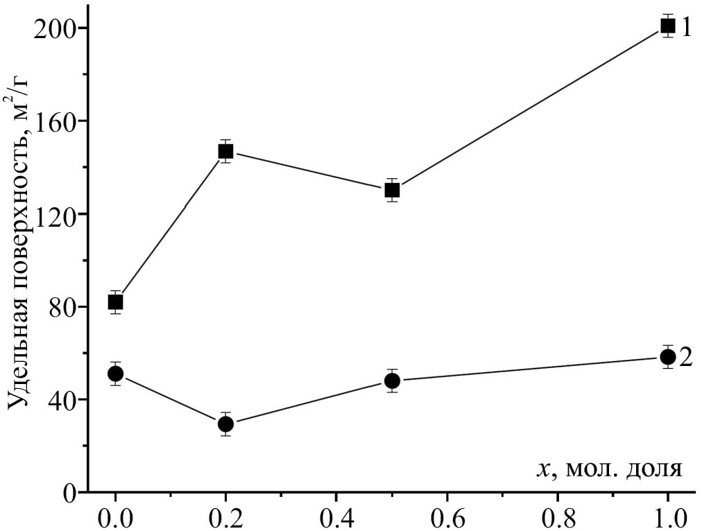 Площадь удельной поверхности порошков измеряли на приборе Nova 1000e (Quantachrome Instruments, США) с использованием азота (99.9999%) в качестве адсорбата. Перед измерениями проводили дегазацию образцов при 100°C в вакууме в течение 16 ч. Удельную площадь поверхности образцов определяли с использованием многоточечного метода Брунауэра-Эммета-Теллера в диапазоне парциальных давлений азота P/P0 0.05–0.35. Расчеты выполняли посредством программного обеспечения NOVAWin 11.03 (Quantachrome Instruments, США).