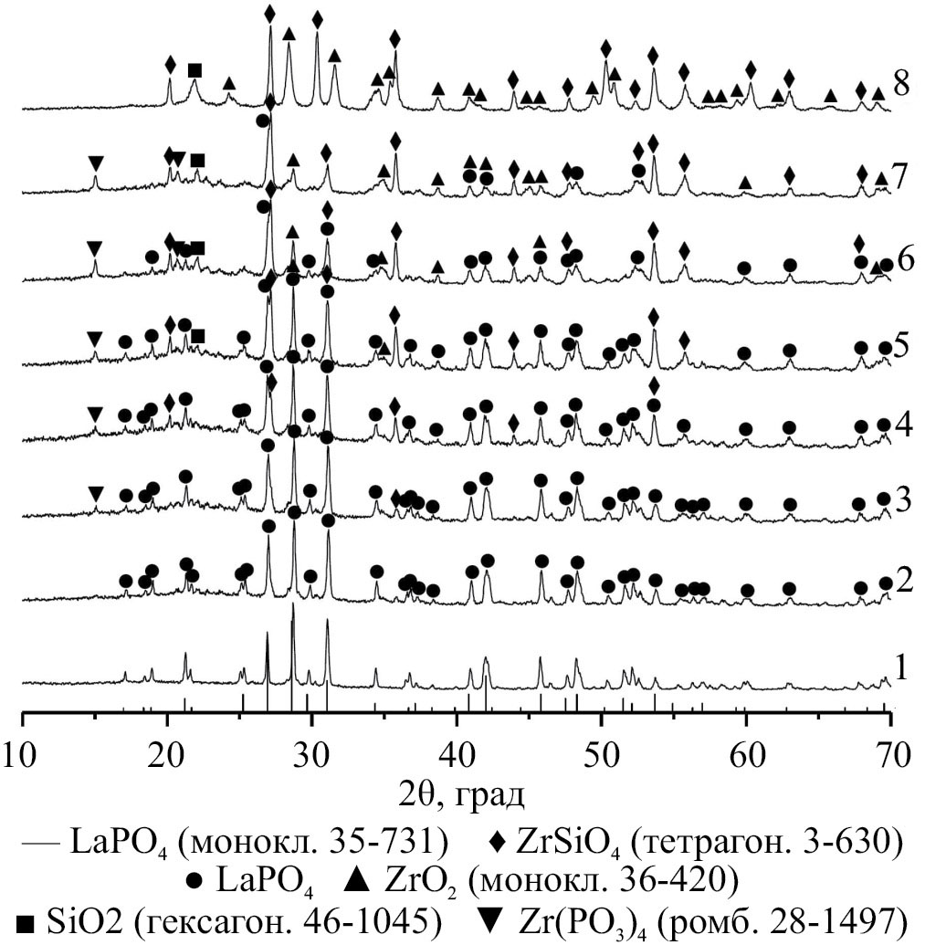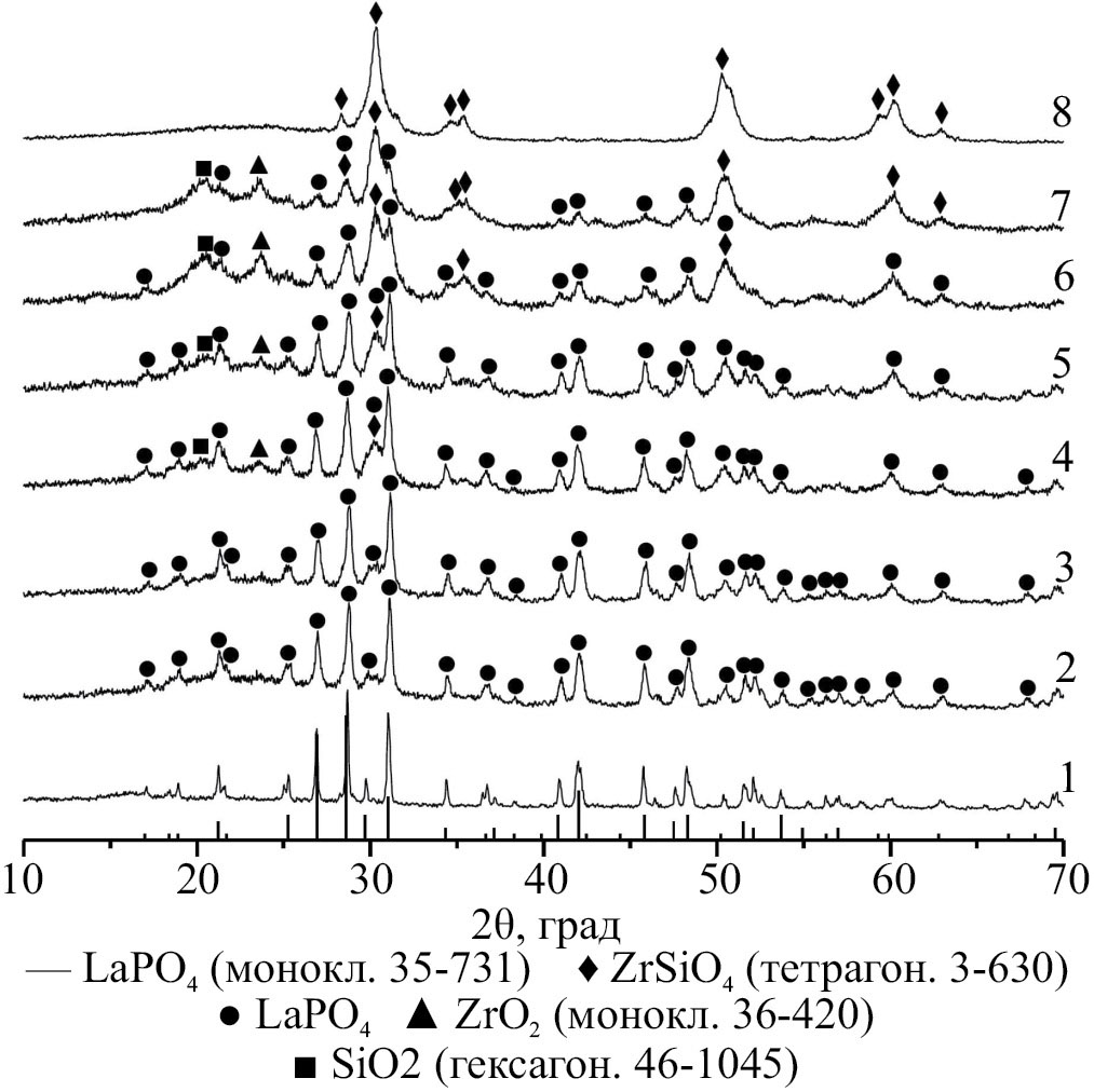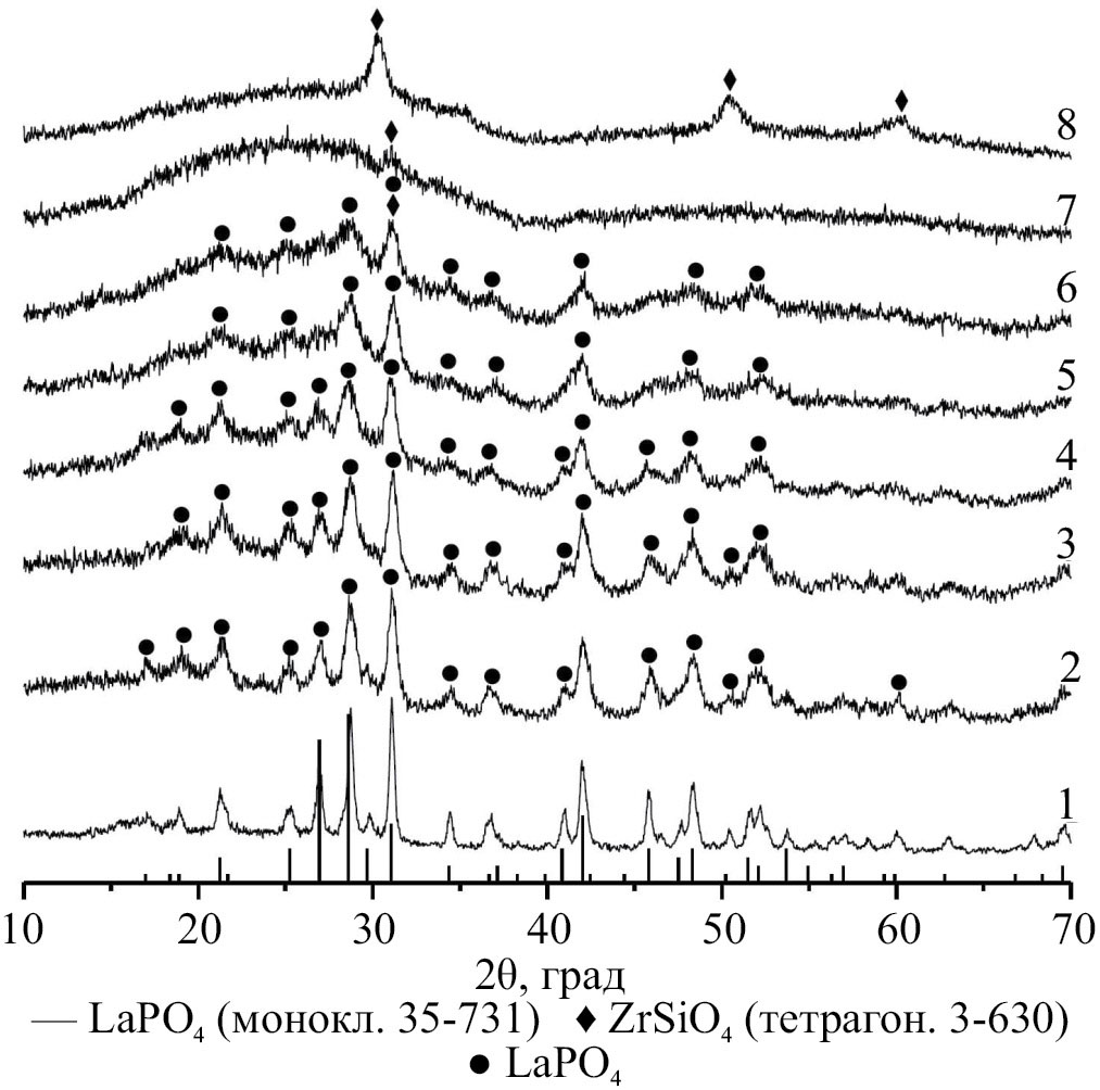 Из представленных на рис. 5 рентгеновских дифрактограмм можно сделать вывод, что в системе при температуре 850°C образуются моноклинный LaPO4 (рис. 5, дифрактограмма 1), слабо закристаллизованный ZrSiO4 (рис. 5, дифрактограмма 8) и смесь моноклинного LaPO4 и практически рентгеноаморфного ZrSiO4 в промежуточных композициях (рис. 5, дифрактограммы 2–7).