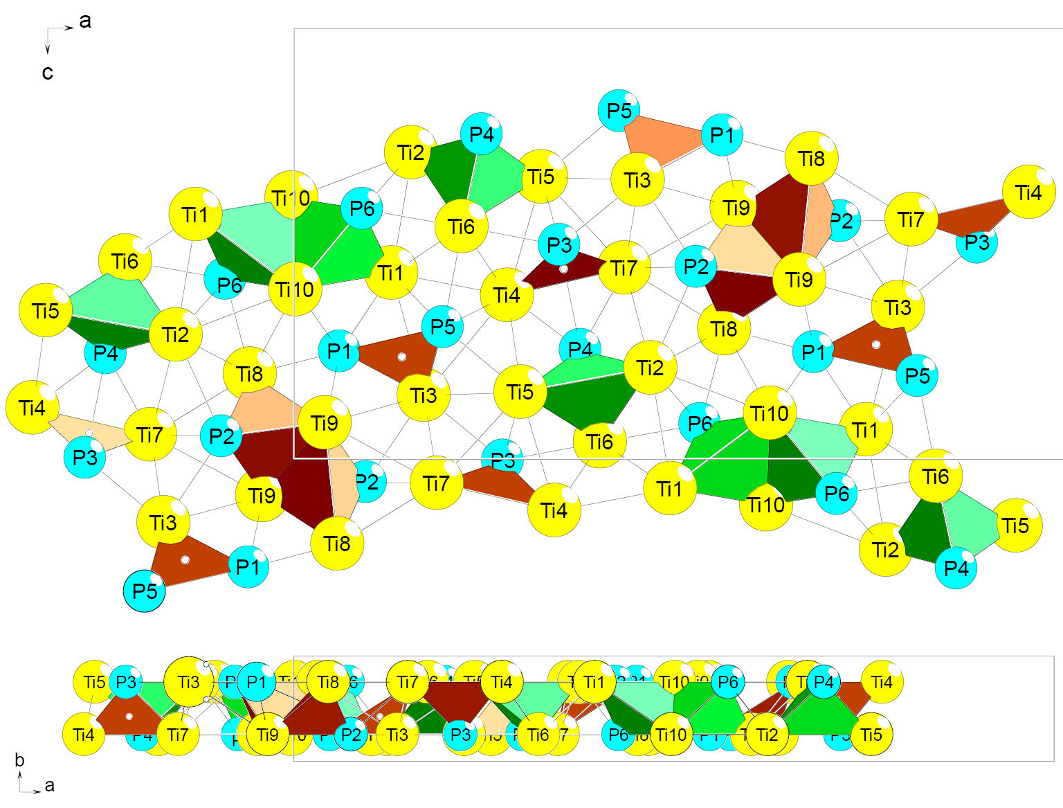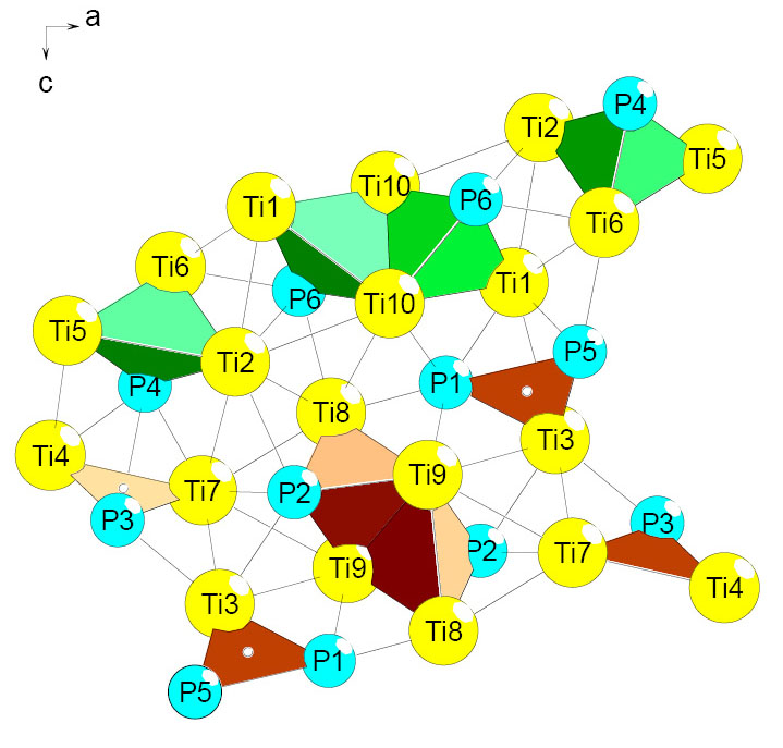 Значения координационных чисел для атомов Ti равны 11 (1 атом), 12 (2 атома), 13 (4 атома) 14 (2 атома), атомов P – 9 (2 атома), 10 (2 атома), 11 (2 атома).