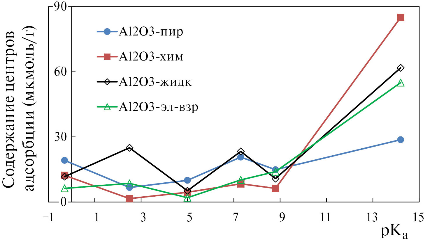 При сопоставлении полученных результатов с данными работ по ИК спектроскопии [21, 23] можно выделить отличия ЛКЦ (pKa = 14.2) для образцов Al2O3-хим и Al2O3-пир, которые здесь оказываются значительно слабее, что может быть связано с низкой прозрачностью образцов в УФ-диапазоне, в котором проводятся измерения оптической плотности для данного индикатора.