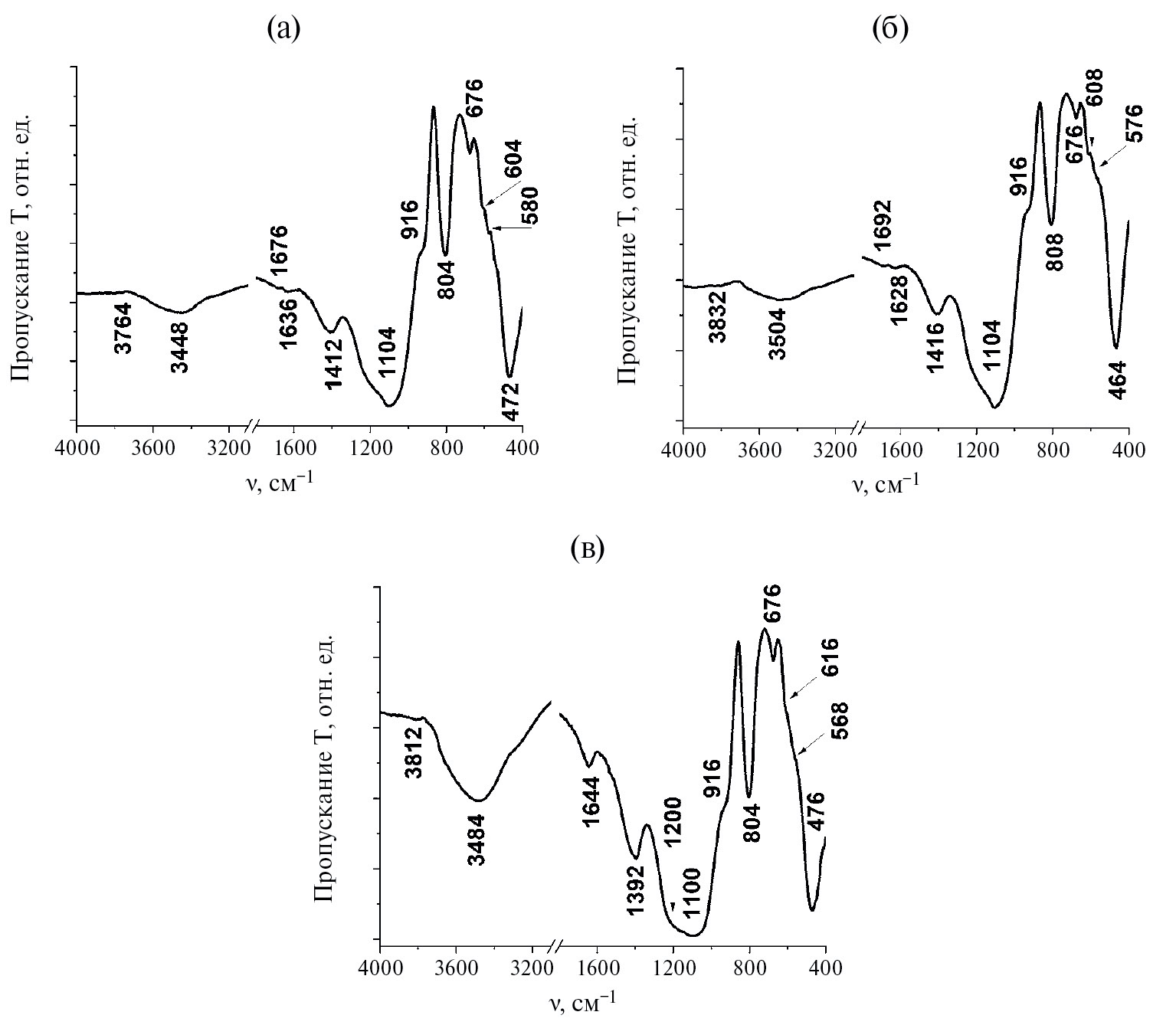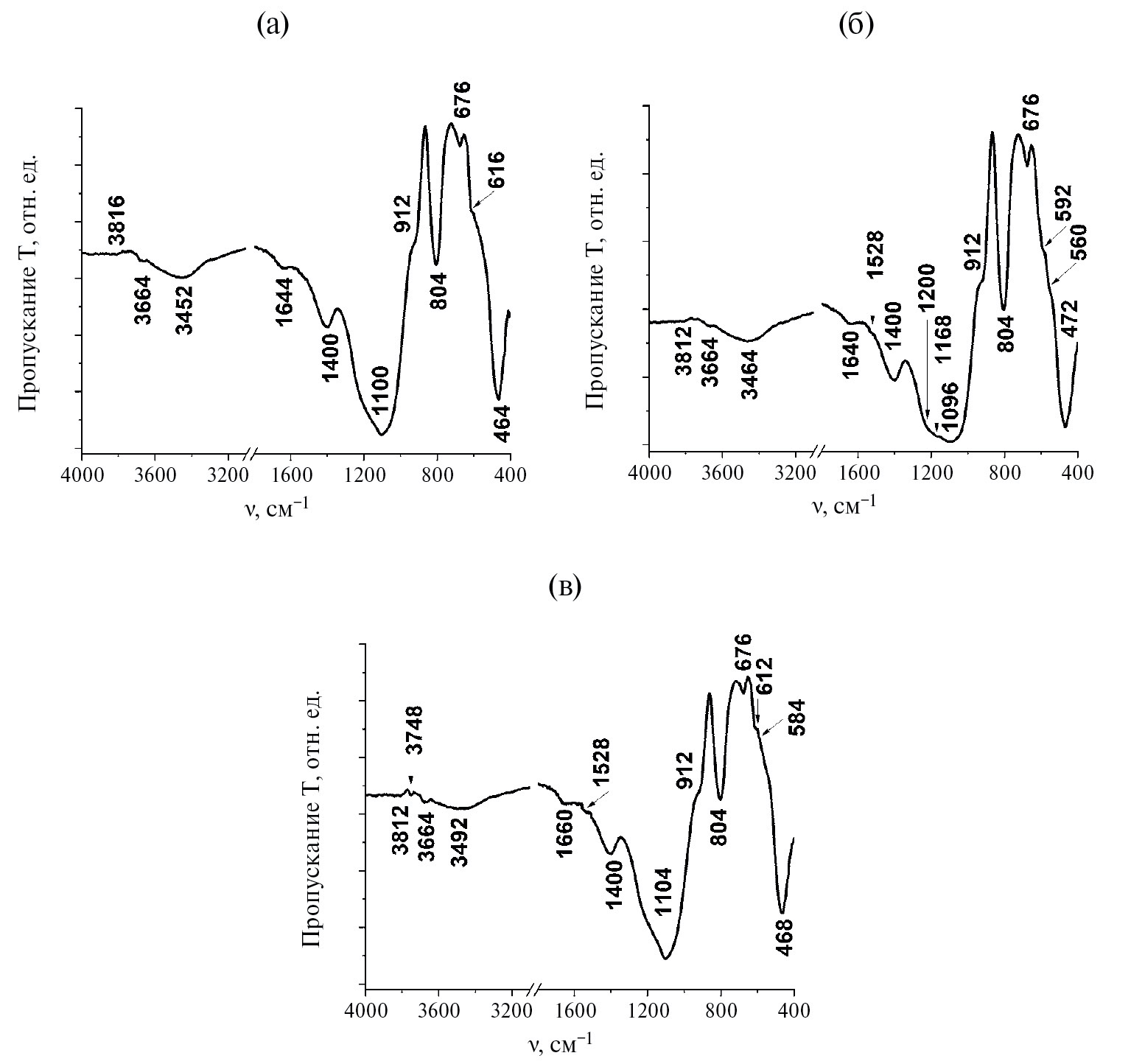 Рис. 3. ИК-спектры пропускания (4000–400 см–1) КМ, термообработанных при 870 °С, в зависимости от состава КМ: (а) Cu/Y, (б) 2Cu/Y, (в) Cu/2Y.