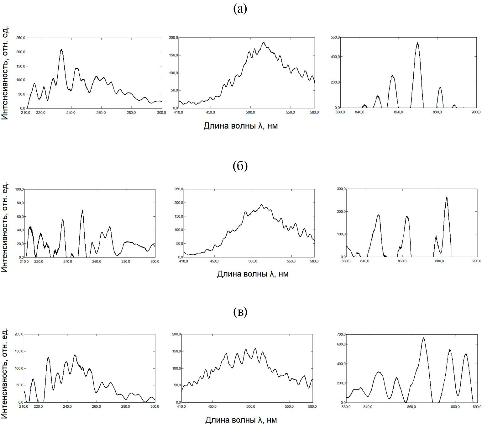 На рис. 9 представлены спектры люминесценции в диапазоне 210–900 нм (при λвозб = 200 нм) образцов КМ Cu/Y, 2Cu/Y, Cu/2Y (на примере тепловой обработки при 870 °С).