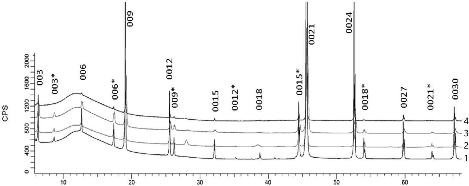 Рис. 2. Дифрактограммы образцов 1 и 2 – без меди, 3 и 4 – легированные Сu (ИНДЕКСЫ дифракции со значком * – принадлежат фазе Sb2Te3, без звездочки – PbSb2Te4).