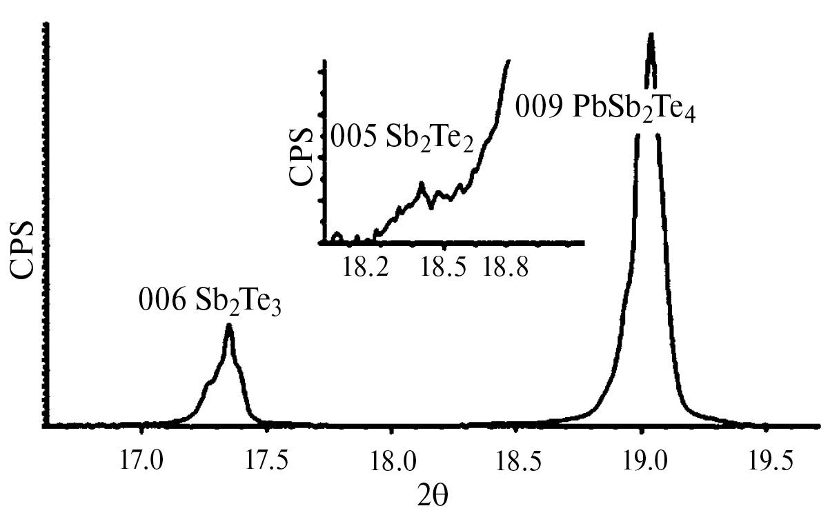 Детальный анализ рентгенограммы поверхности скола вдоль плоскости [003] показал (рис. 3), что помимо основных фаз PbSb2Te4 и Sb2Te3 обнаруживаются следы фазы Sb2Te2 с гексагональной структурой P`3m1 (164) и параметрами а = 0.425 нм, с = 2.390 нм (ICDD PDF2 01-072-2183). Причем просматриваются только ее чрезвычайно слабые рефлексы от плоскостей, обладающих преимущественной ориентировкой [001] (на рис. 3 – 2Θ = 18.5°, HKL 005), большая часть рефлексов накладываются на имеющие гораздо более высокую интенсивность линии основных фаз).