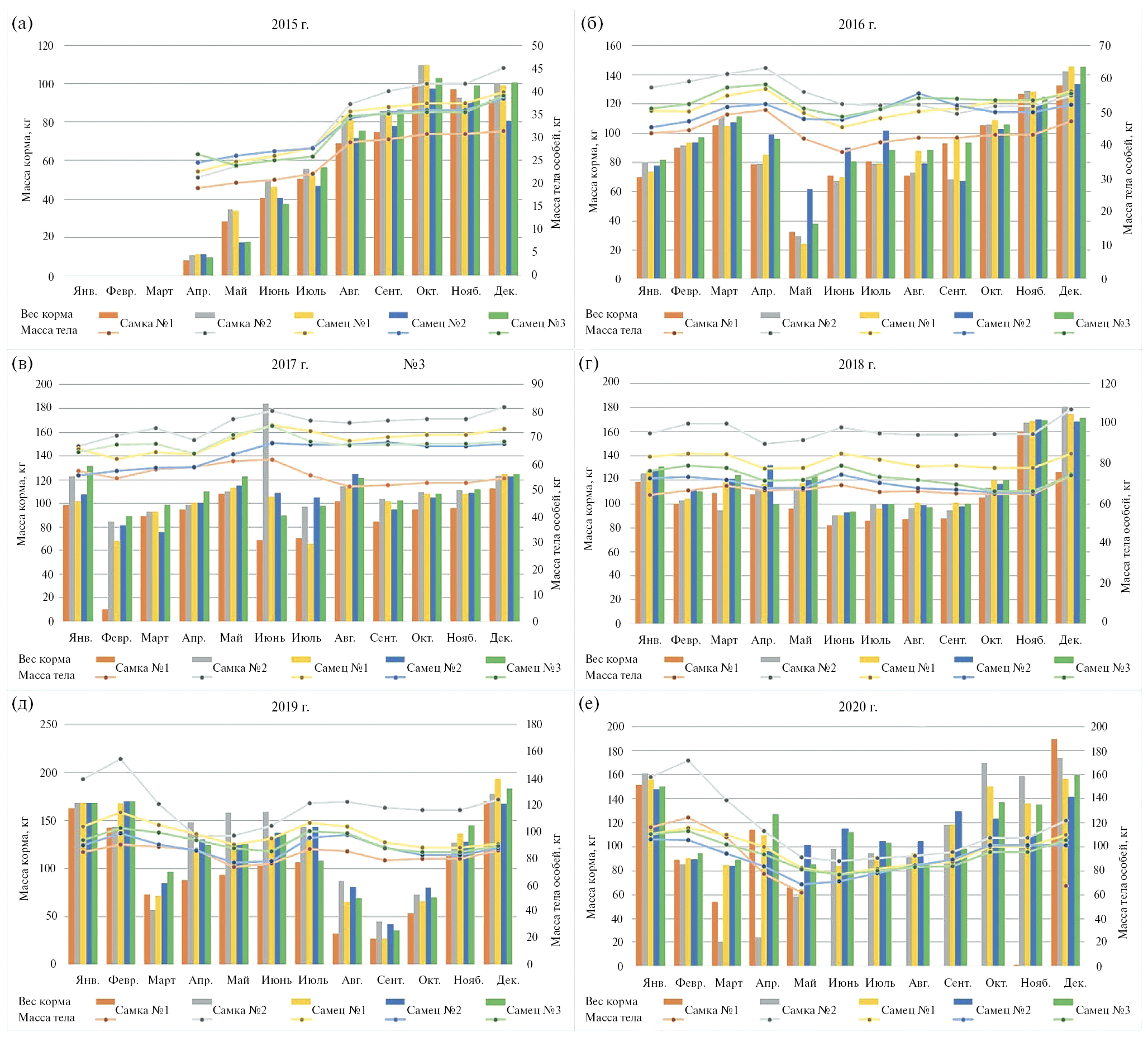 Повышение количества потребляемого корма самкой № 2 в апреле 2019 г. вызвано длительным голоданием животного в марте: 6 марта она принесла потомство и в период вскармливания детеныша воздерживалась от пищи. Самка потеряла 20 кг массы тела во время родов и еще 45 кг за 3 недели вскармливания. У остальных особей весовые показатели за этот год были относительно стабильными и соответствовали сезонным циклам (рис. 1д, 2д).