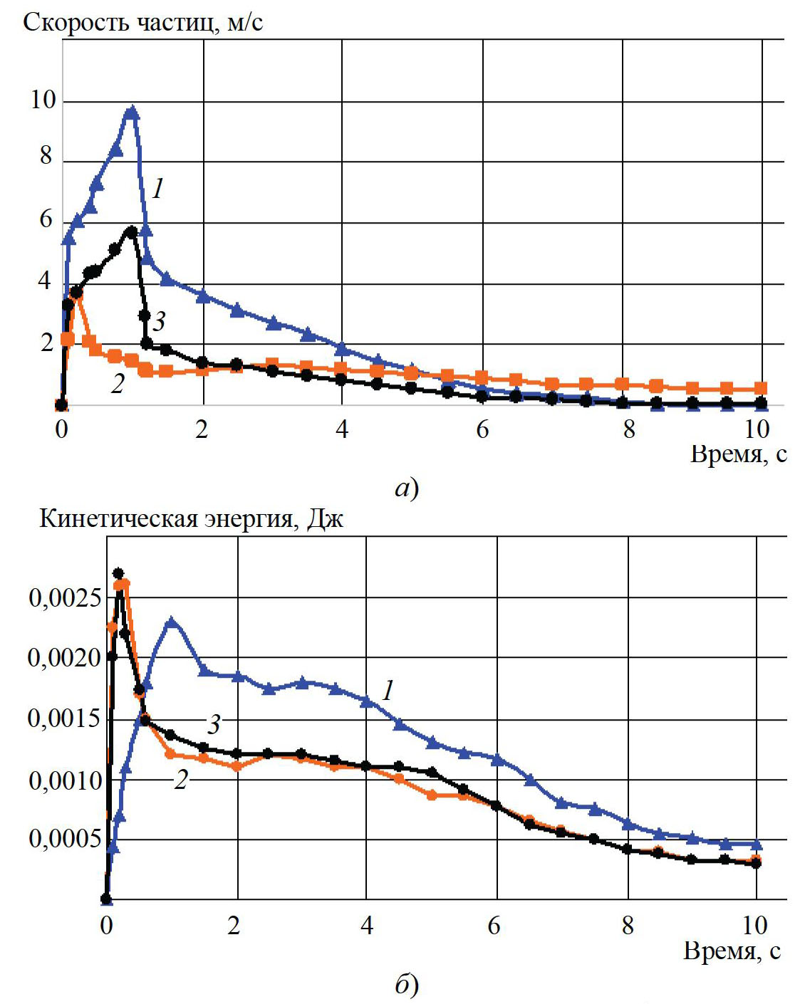 Рис. 4. Зависимости скорости (а) и кинетической энергии (б) частиц во времени при соотношениях смешиваемых компонентов: 1 ‒ 1 : 1; 2 ‒ 1 : 3; 3 ‒ 1 : 5