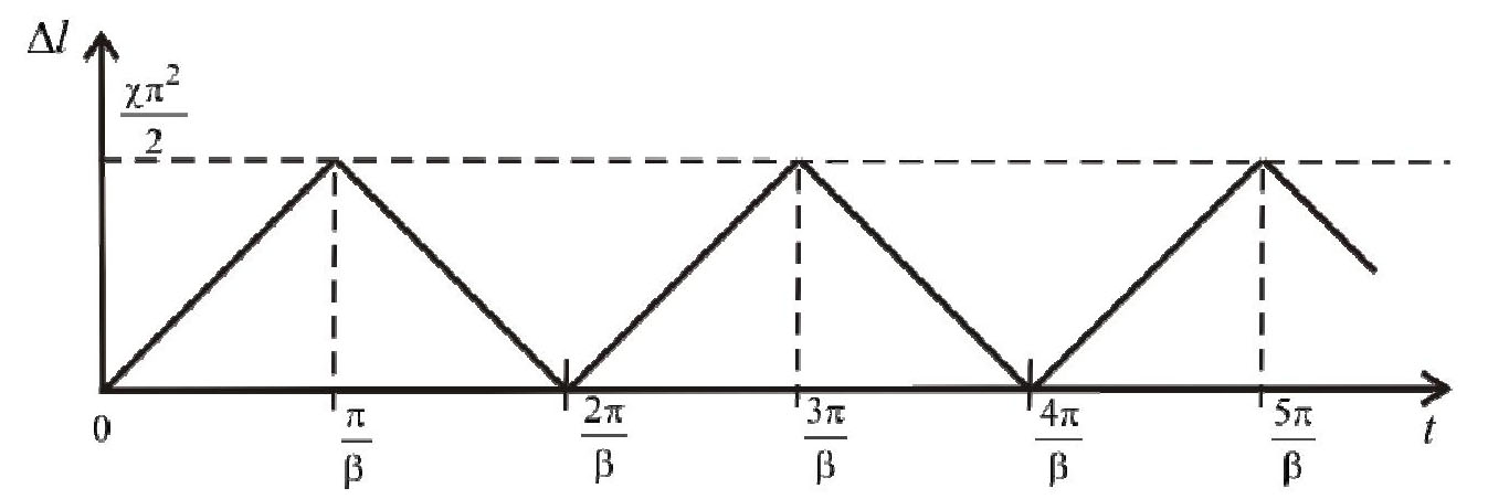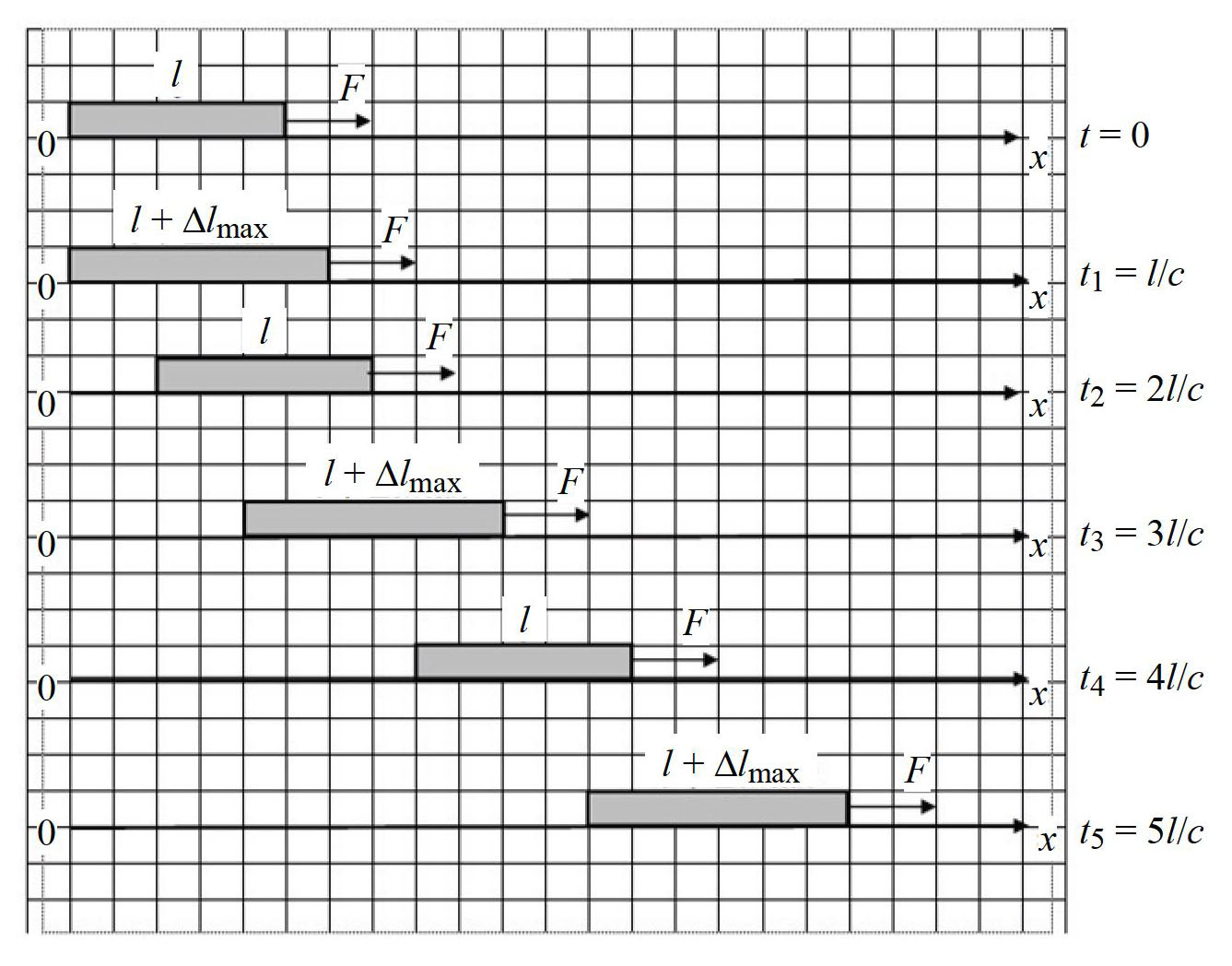 На рисунке 3 показано движение стержня за интервалы времени, кратные l/c, в условиях внезапно приложенной к стержню продольной силы. При поступательном движении стержня его длина периодически изменяется на одинаковую величину Δlmax. В ходе поступательного движения стержень периодически растягивается и сжимается до исходной длины. Очевидно, когда стержень приобретает исходную длину, в процессе своего движения, внутренняя динамика стержня, обусловленная силой инерции в данный момент, эквивалентна его внутренней динамике, соответствующей интервалу времени l/c.