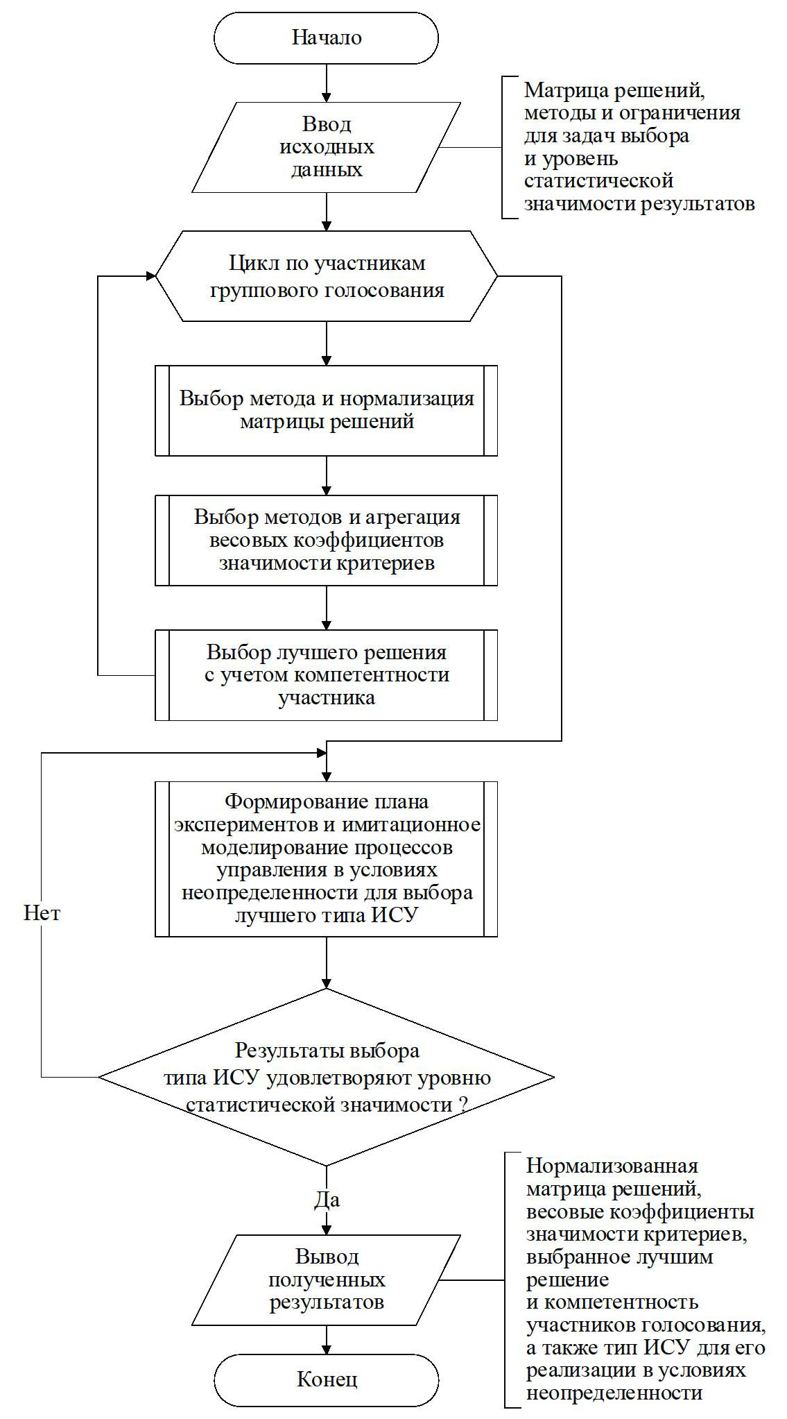 Алгоритмическое обеспечение проблемно-ориентированной СППР включает: ввод исходных данных (матрица решений для вариантов нанесения гальванического покрытия), нормализацию матрицы решений, агрегацию весов критериев в ней, определение оптимального решения (оборудования) путем группового голосования и формирование планов экспериментов по расчету параметров управления (рис. 3). Если результаты не удовлетворяют требуемой значимости по статистическому критерию χ2, то процесс расчета повторяется, иначе выводятся полученные результаты (выбранное оборудование и параметры управления) для ТСПГП.