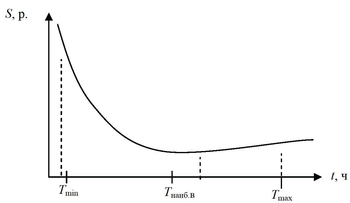 В работе продолжительность выполнения операции рассматривается как функциональная зависимость времени ее выполнения от стоимости (рис. 2). Характер зависимости определяется индивидуально для каждой единицы оборудования. При отсутствии таких зависимостей используются экспертные оценки сотрудников конкретного предприятия.