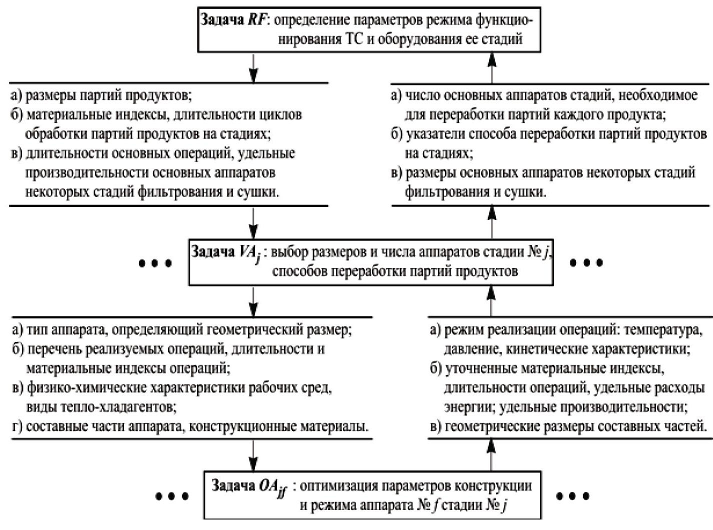 Предлагаемая стратегия декомпозиции задачи определения аппаратурного оформления ТС МХП, в отличие от рассмотренных ранее [2 – 4], базируется на принципе разделения параметров задачи по характеру их изменения: отделения параметров режима функционирования ХТС, изменяющихся непрерывно, от дискретных характеристик оборудования ее стадий. С учетом определяющего влияния параметров режима функционирования ХТС на AO стадий системы в качестве задачи верхнего уровня иерархии выбрана задача RF оптимизации параметров режима функционирования ХТС при выпуске в течение планового периода Тр всех продуктов заданного ассортимента I в требуемых объемах Qi, i = 1, ..., I. На среднем уровне решаются задачи VAj, j = 1, …, J, выбора определяющих размеров и числа основных аппаратов каждой из J ее стадий, а также способов переработки партий продуктов основными аппаратами каждой стадии системы. На нижнем уровне – задачи OAjf оптимизации параметров конструкции и режима функционирования f-го аппарата стадии j (рис. 1).