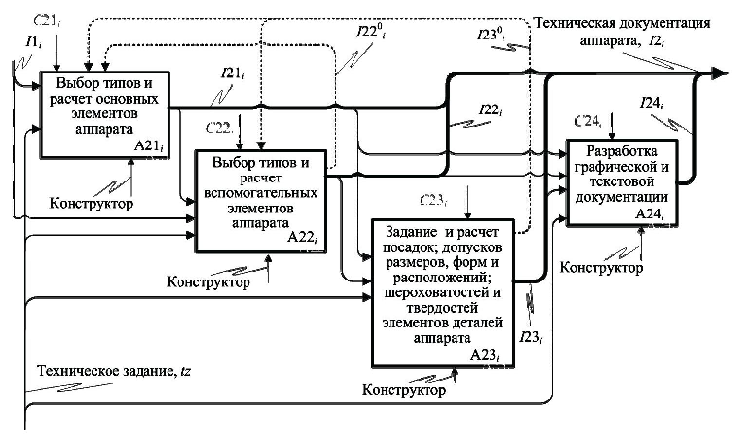 tz – техническое задание на разработку аппарата; I1, I2 – соответственно основные и вспомогательные элементы аппарата и их размеры; С21, С22, С23, С24 – нормативные документы, методики расчетов; I21, I22– типы вспомогательных элементов и их основные размеры соответственно; I23 – унитарные (зависящие от основных) размеры вспомогательных элементов аппарата; I24 – графическая и текстовая документация на элементы аппарата; I22⁰ – перечень и размеры вспомогательных элементов, выбор которых может повлиять на результаты поиска параметров основных элементов; I23⁰ – перечень значений формы и расположения, выбор которых может повлиять на результаты выбора основных или вспомогательных элементов