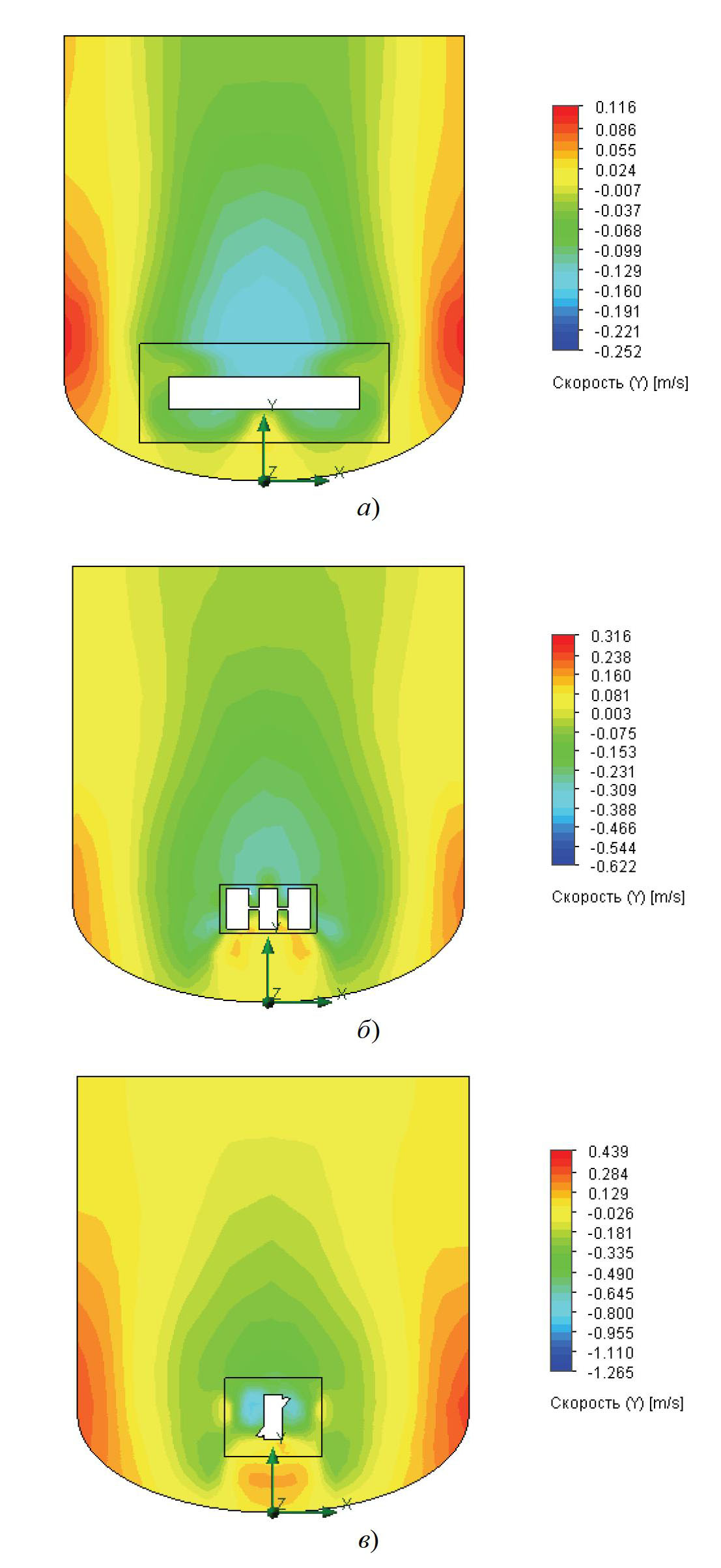 Рис. 3. Поля скоростей перемешиваемой жидкости в вертикальном емкостном аппарате при оптимальных значениях параметров мешалок: а – двухлопастной; б – турбинной открытой; в – трехлопастной