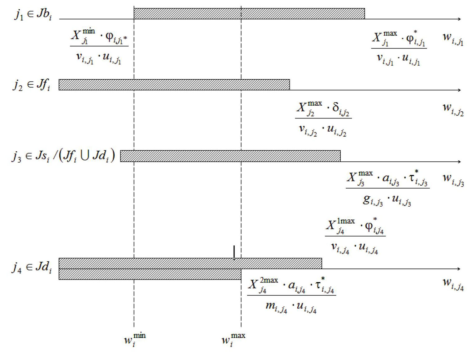где wij – возможные значения размера партии i-го продукта при их обработке в аппаратах стадии j, определяемые по результатам вычислений нижних и верхних оценок определяющих размеров основных аппаратов стадий ХТС, а также верхних оценок длительностей переработки партий продуктов на стадиях j ∈ Jsi (рис. 4);