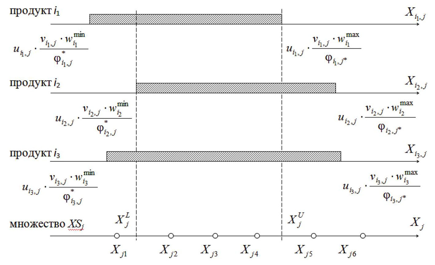 Рис. 5. Иллюстрация к условию (5): для стадии j ∊ Jbᵢ, i =i₁, i₂, i₃: [Xⱼᴸ,Xⱼᵁ]⋂XSⱼ = {Xⱼ₂,Xⱼ₃,Xⱼ₄}