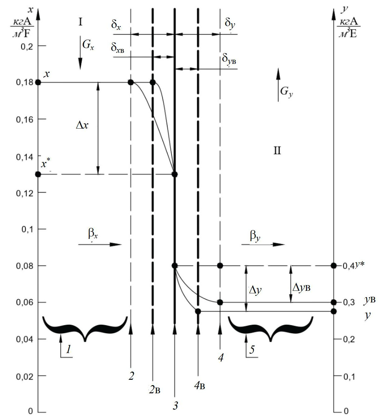 1 – ядро потока сплошной фазы очищаемого раствора; 2 – пограничный слой со стороны сплошной фазы; 3 – граница раздела фаз (поверхность капли); 4 – пограничный слой со стороны дисперсной фазы в экстрагенте; 5 – ядро капли экстрагента (в – виброэкстракционный процесс, — — — – пограничный слой в режиме без вибрации; — — — с вибрацией)