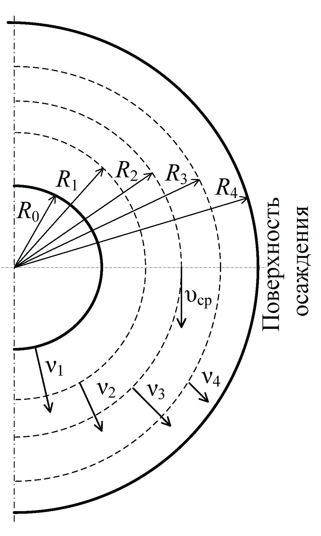 Принимается, что скорость осаждения данных частиц νос равна скорости прохождения расстояния от выбранного сечения до стенки осаждения, то есть νос1 = ν1 (при R = R0), νос2 = ν2 (при R = R1), νос3 = ν3 (при R = R2), νос4 = ν4 (при R = R3).