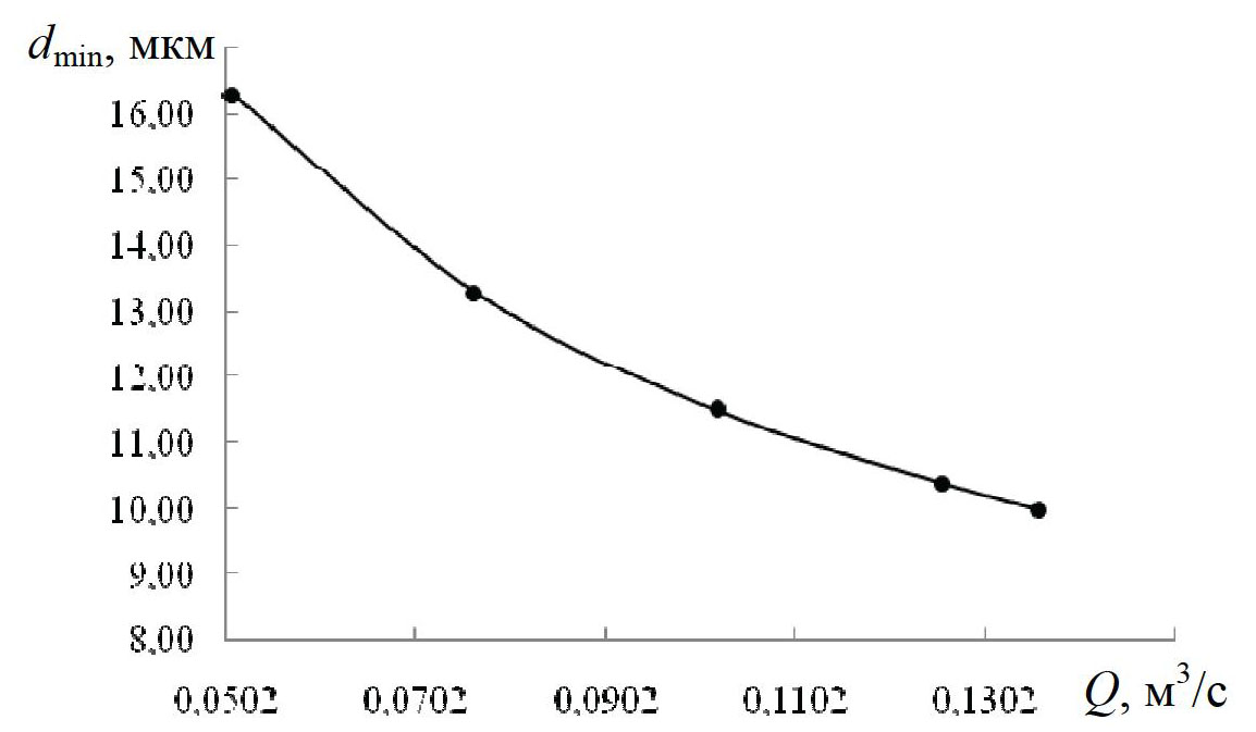 Результаты расчетов представлены в табл. 1. График зависимости минимального размера частиц, оседающих на поверхности в первой ступени пылеуловителя-классификатора, от объемного расхода пылегазовой смеси показан на рис. 3.