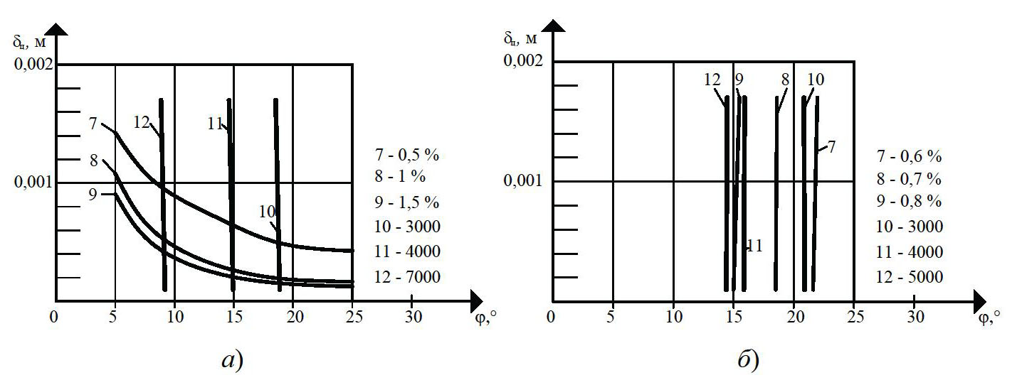 Критерий подвулканизации JB в большей степени зависит от зазора dц, чем от угла наклона нарезки j при изотермическом режиме экструзии (см. рис. 10, а). Причем, чем больше зазор dц (на 100 %) в области реальных значений угла наклона нарезки j, тем меньше критерий подвулканизации JB (на 66 %), что связано с уменьшением времени пребывания резиновой смеси в материальном цилиндре за счет большей производительности Q. Критерий подвулканизации JB практически не зависит от зазора dц, а в большей степени зависит от угла наклона нарезки j при неизотермическом режиме экструзии (см. рис. 10, б), что связано с малой величиной потока утечки в зазоре dц.