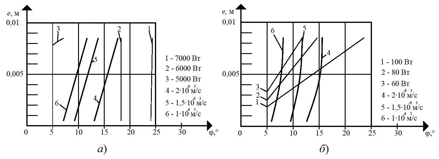 На рисунке 1 показано влияние угла наклона винтовой линии j и глубины винтового канала червяка h на полезную мощность N, производительность Q. Очевидно, что изменение угла наклона нарезки j на 33 % в области своих реальных значений (15…20°) увеличивает полезную мощность N на 20 % (см. рис. 1, а). Увеличение глубины винтового канала червяка h (0,004…0,006 м) на 50 % приводит к увеличению полезной мощности N на 25 % (кривые 1 – 3), так как с увеличением глубины винтового канала h захватывается больше перерабатываемого материала, и, следовательно, требуется большее усилие на транспортирование резиновой смеси вдоль канала червяка. Как видно из рис. 1, б, угол наклона нарезки j в области своих реальных значений (15…20°) и глубина винтового канала h (0,004…0,008 м) незначительно влияют на изменение полезной мощности N (2 – 8 %), так как с изменением угла наклона нарезки j гидравлическое сопротивление материала в винтовом канале практически не изменяется.