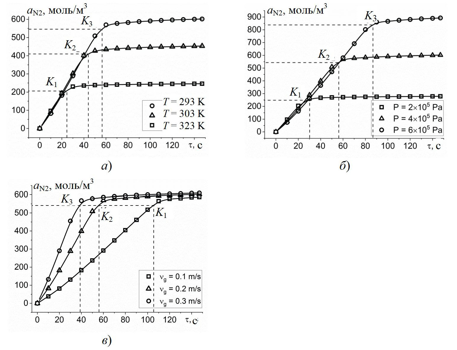 Рис. 1. Кинетические кривые адсорбции азота на цеолитовом адсорбенте NaX: a – при температурах газовой смеси 293, 303, 323 K; б – при давлениях газовой смеси (2, 4, 6)105 Па; в – при скоростях газового потока 0,1; 0,2; 0,3 м/c (точки – эксперимент; линии – расчет; K1, K2, K3 – точки разграничения