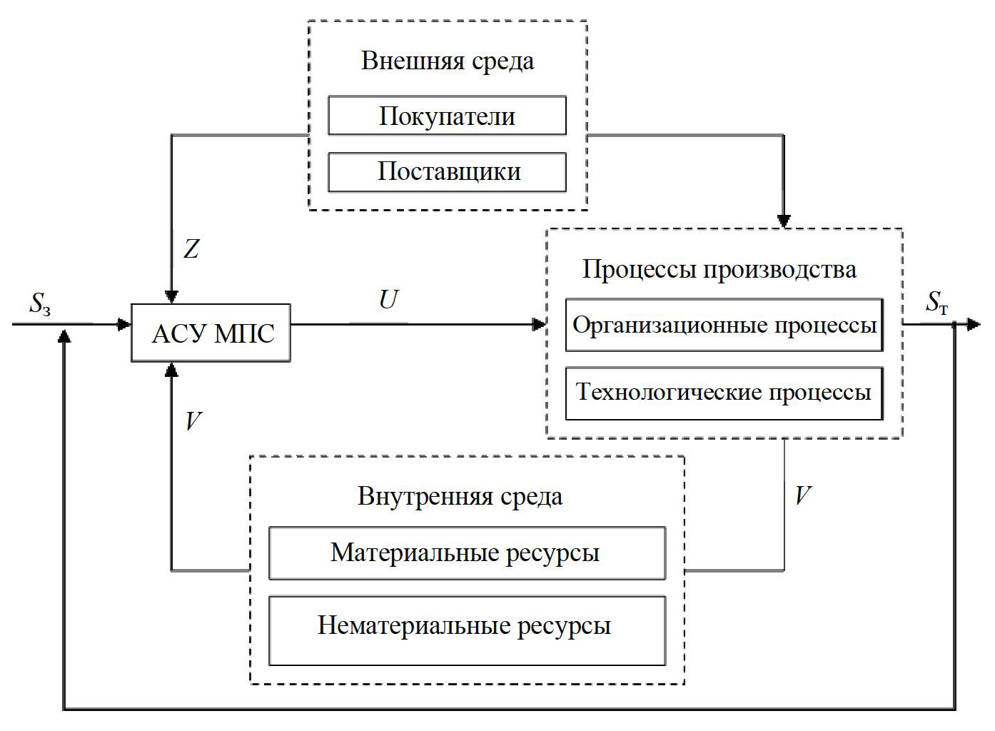 Sз, Sт – соответственно заданное и текущее состояние МПС; U, Z, V – воздействия соответственно управляющее, внешней и внутренней среды