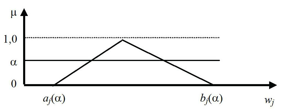 Представим в форме треугольных функций принадлежности m(pj) и m(wj) (рис. 1, 2). Если функции принадлежности нечеткой вероятности и нечеткой важности выпуклые и непрерывные, то a-сечение есть замкнутый интервал. Функцию принадлежности каждого показателя будем строить для тех же a, и a-сечения важности каждого показателя есть замкнутый интервал с границами [9, 10]:
