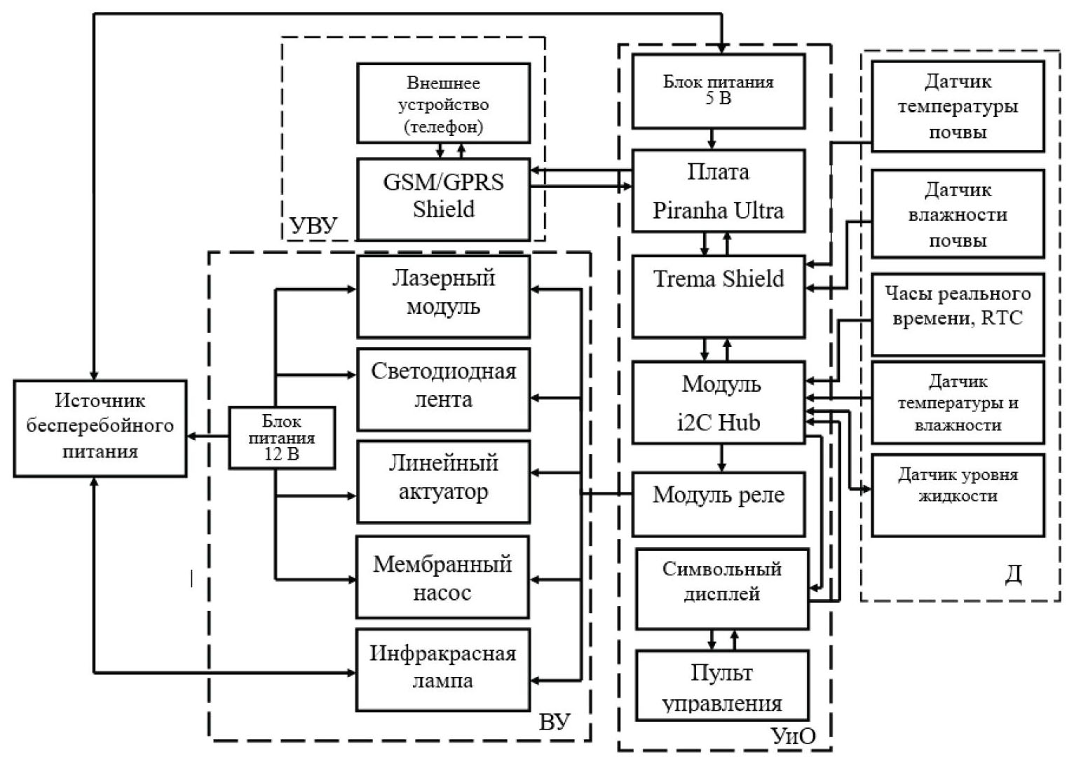 Блок Д содержит датчики для контроля за микроклиматом: температуры почвы; влажности почвы, температуры и влажности воздуха, уровня жидкости в емкости для полива и часы реального времени.
