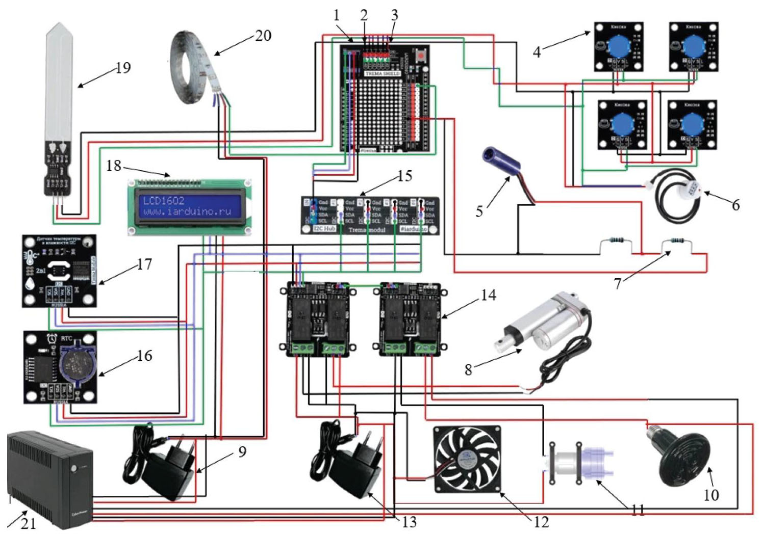 1 – плата Piranha Ultra R3; 2 – устройство для подключения Trema Shield; 3 – GSM/GPRS Shield для подключения телефона; 4 – кнопка (Trema-модуль V2.0); 5 – лазерный модуль; 6 – бесконтактный датчик уровня жидкости XKC-Y25-V; 7 – набор резисторов MAXI для Arduino; 8 – линейный актуатор XDHA12-50; 9 – источник питания на 12В (2А); 10 – ИК-лампа; 11 – мембранный насос 385; 12 – вентиляторы 12 В; 13 – источник питания на 5 В; 14 – модуль реле, 2-канала, FLASH-I2C; 15 – i2C Hub для подключения периферийных устройств; 16 – часы реального времени, RTC; 17 – датчик температуры и влажности, FLASH-I2C; 18 – символьный дисплей LCD1602 IIC/I2C; 19 – датчик влажности почвы, емкостной; 20 – светодиодный светильник ФОТОН ПРОМ; 21 – ИБП Cyberpower UTC650E