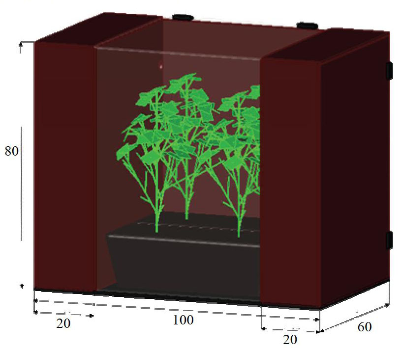 Конструкция БТС-Р предполагает наличие трех отсеков, каждый из которых несет за собой определенную роль (рис. 4). Крайние отсеки симметричны и имеют размеры, см: длина – 20; высота – 80; глубина – 60. В левом отсеке находится емкость для полива, которая специально размещена отдельно, чтобы вода в БТС-Р не контактировала с электроникой. В правом отсеке расположена электронная составляющая БТС-Р, а именно центр управления системой – микроконтроллер. Главный отсек БТС-Р, где располагаются растения, является самым большим, см: длина – 60; высота – 80; глубина 60. Помимо растений, внутри располагаются датчики, которые контролируют микроклимат и воздействующие устройства.