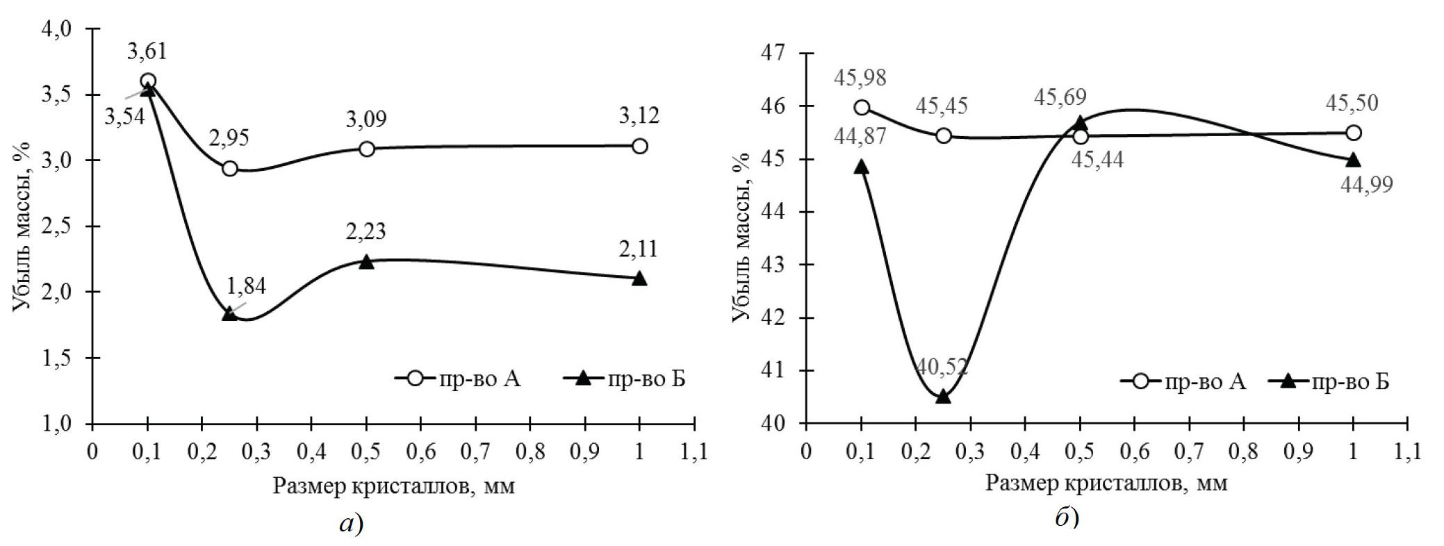 На рисунке 2 представлены усредненные значения убыли массы образцов хлората натрия каждого производителя. Исследования показали, что потеря массы у хлората натрия производства А при температуре 420 °С для всех фракций составила около 3 %, при температуре 500 °С – 45 %; у хлората натрия производства Б при 420 °С для всех фракций составила около 2 %, при температуре 500 °С для фракций с размером кристаллов до 0,25 мм и больше 0,5 мм – около 45 %, для фракции от 0,15 до 0,45 мм – около 40 %.