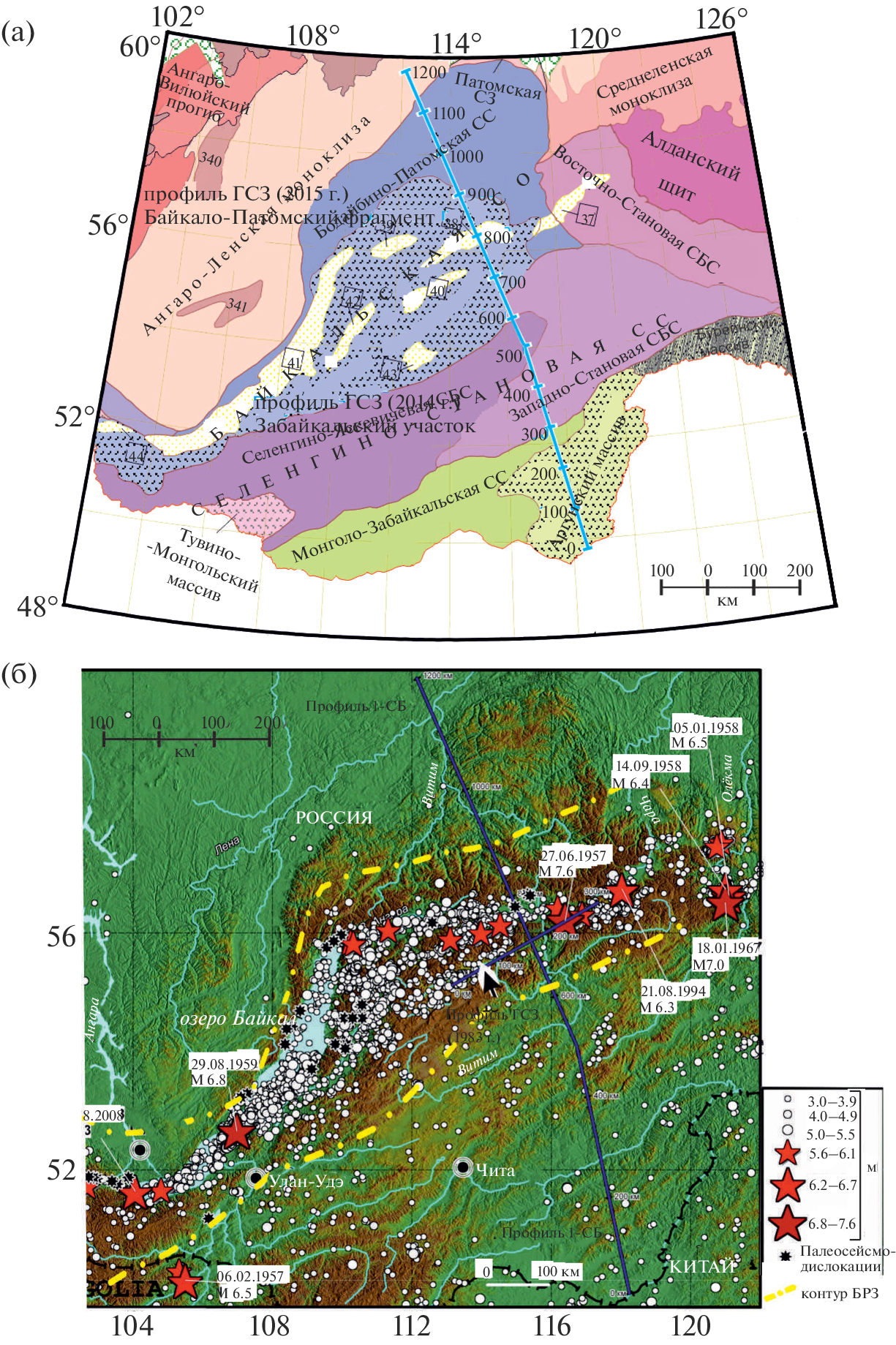 Представлен анализ сейсмичности и глубинного строения Забайкалья в створе опорного геофизического профиля 1-СБ. Установлено сложное неоднородное строение земной коры и верхней мантии. Мощность земной коры изменяется от 40 км в юго-восточной части профиля и на участках межгорных впадин в северо-западной части до 48 км на участках горных хребтов. Сильно изменяются и значения граничных скоростей по границе М от повышенных значений в 8.4‒8.5 км/с для Р‑волн и 4.9‒4.95 км/с для S-волн (в особенности в юго-восточной части профиля) до пониженных значений в 7.8‒8.0 км/с для Р-волн и 4.6‒4.7 км/с для S-волн на участке Байкальской рифтовой зоны в северо-западной части профиля. Сильное неоднородное строение среды по значениям скоростей упругих волн, отношениям скоростей Vp/Vs и коэффициенту Пуассона установлено для верхней и средней коры на глубинах 8‒20 км. Установлена приуроченность зон повышенной сейсмичности к блокам земной коры с неоднородным скоростным строением по данным разнополяризованных Р- и S‑волн. Повышенной неоднородностью в верхней части земной коры по данным скоростей упругих волн и вторичных параметров среды (отношениям Vp/Vs, параметру K* = Vp/(γ ‒ 1), где γ = Vp/Vs, коэффициенту Пуассона (σ)) характеризуется район Байкальской рифтовой зоны, в непосредственной близости от крупнейшего Муйского землетрясения 1957 г. с М = 7.6. Выделен в створе профиля также ряд других неоднородных глубинных зон по аномалиям скоростей Р- и S-волн и вторичных параметров среды, в разной степени коррелирующих с сейсмоактивными участками по данным многолетних инструментальных наблюдений. Установленная однозначная связь крупных неоднородных зон верхней коры Забайкалья с накоплением напряжений и их разрядкой в виде сильных землетрясений позволяет делать обоснованным среднесрочный прогноз катастрофических событий.