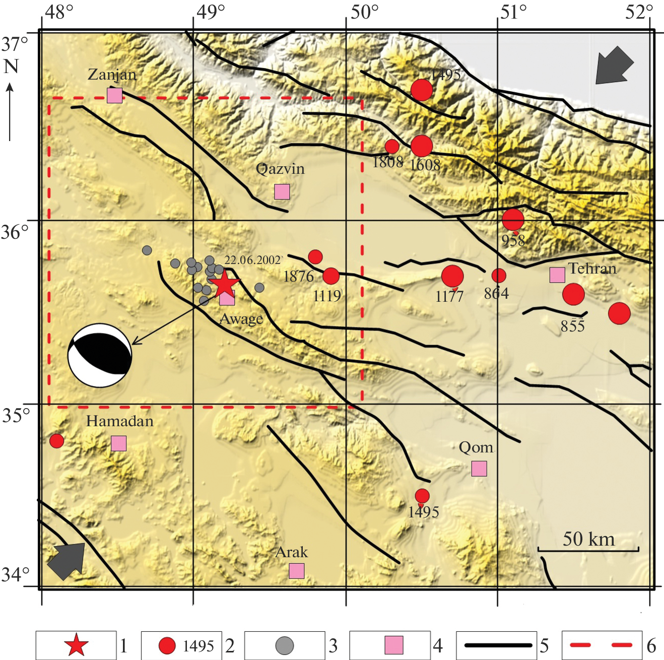 - Walker R. T., Bergman E., Jackson J., Ghorashi M., Talebian M. The 2002 June 22 Changureh (Avaj) earthquake in Qazvin province, northwest Iran: epicentral relocation, source para-meters, surface deformation and geomorphology // Geophysical J. International. 2002. V. 160. Iss. 2. P. 707–720. https://doi.org/10.1111/j.1365-246x.2005.02516.x