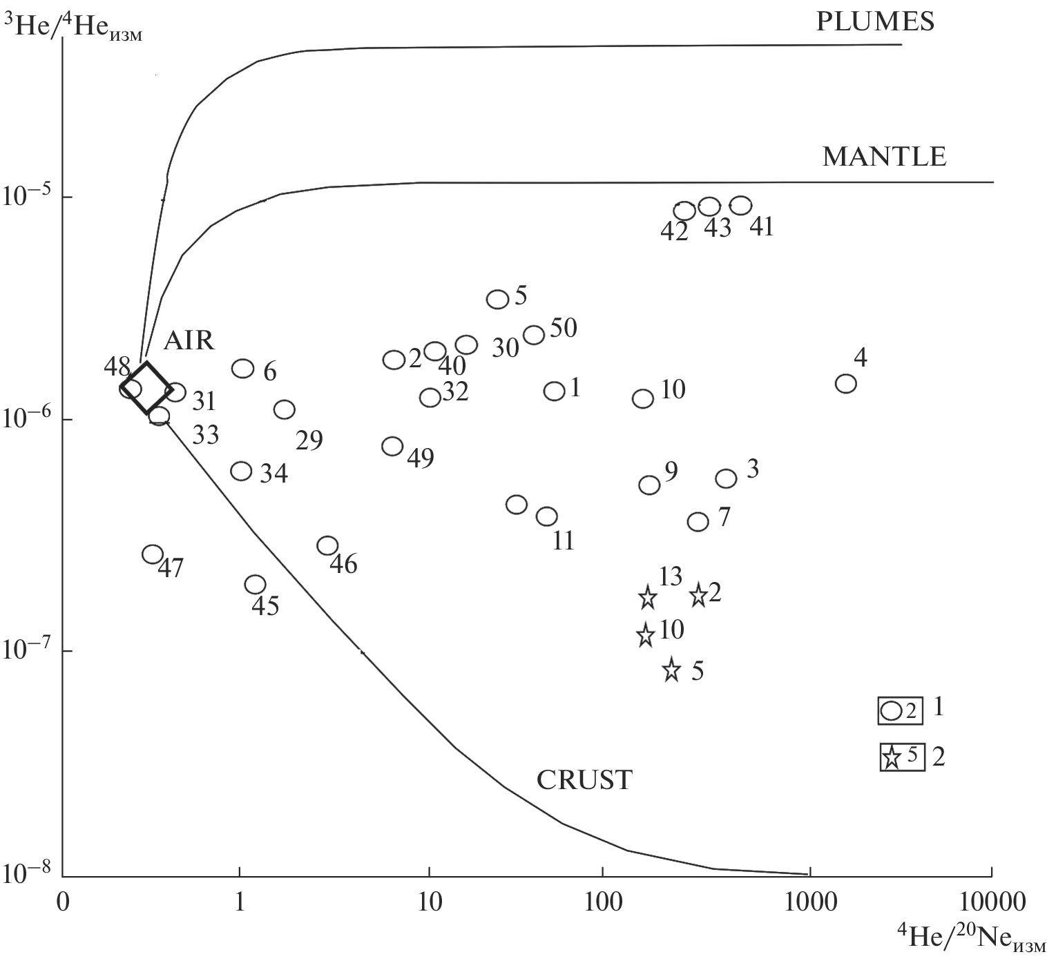 The paper considers isotopic composition of helium (3Не/4Не = R) in groundwater of South-Baikal (SBVA) and South-Khangai volcanic areas (SKhVA) during the Late Cenozoic period. The differences in the behavior and magnitude of the parameters were established. It is found that the mentioned differences in 3Не/4Не concentrations within South-Baikal and South-Khangai volcanic areas correspond to mantle reservoirs with different helium isotope compositions. This confirms that the Late Cenozoic volcanism of South-Baikal and South-Khangai volcanic area is controlled by mantle sources related to mantle plumes of the Central-Asian hot mantle field.