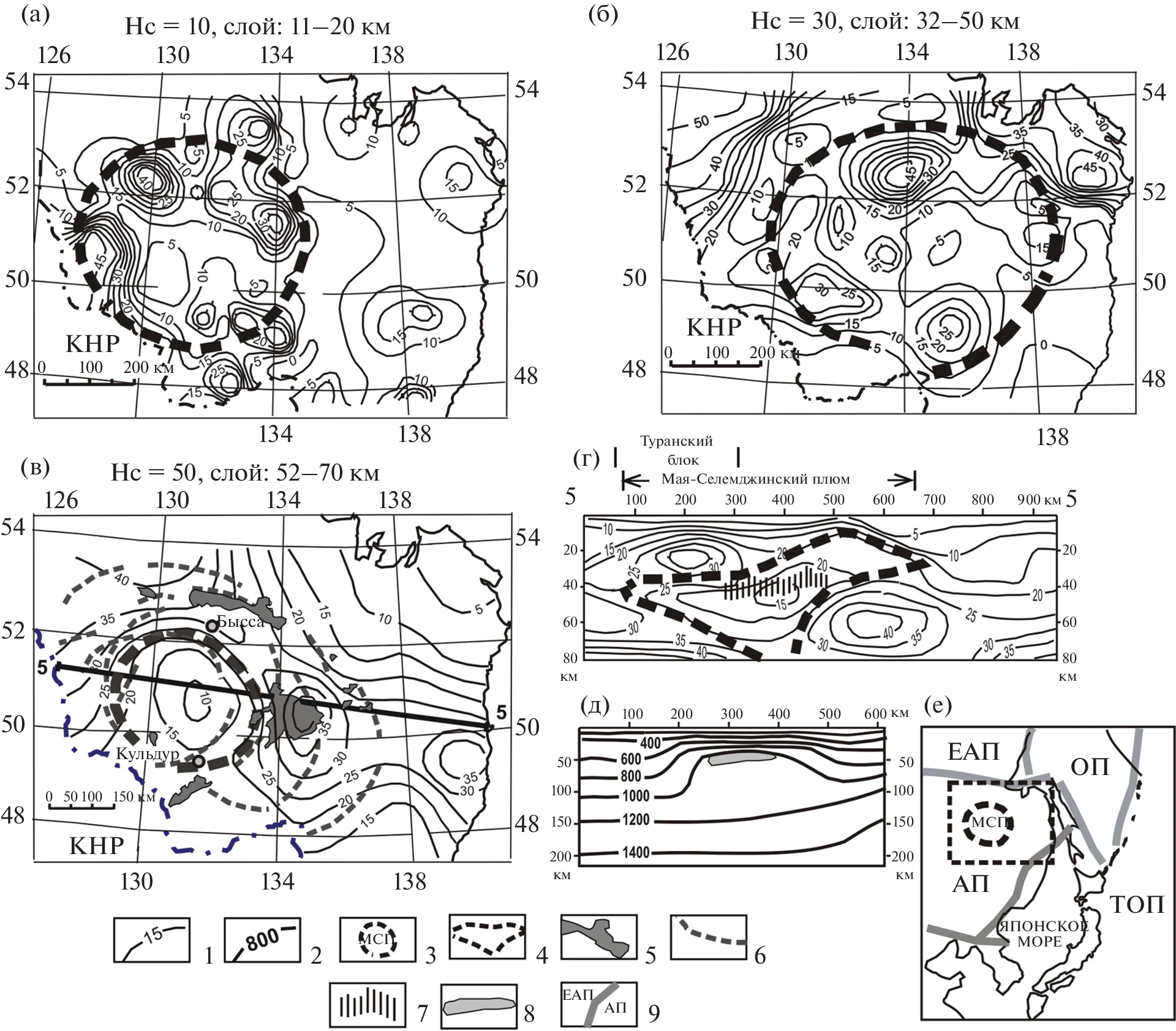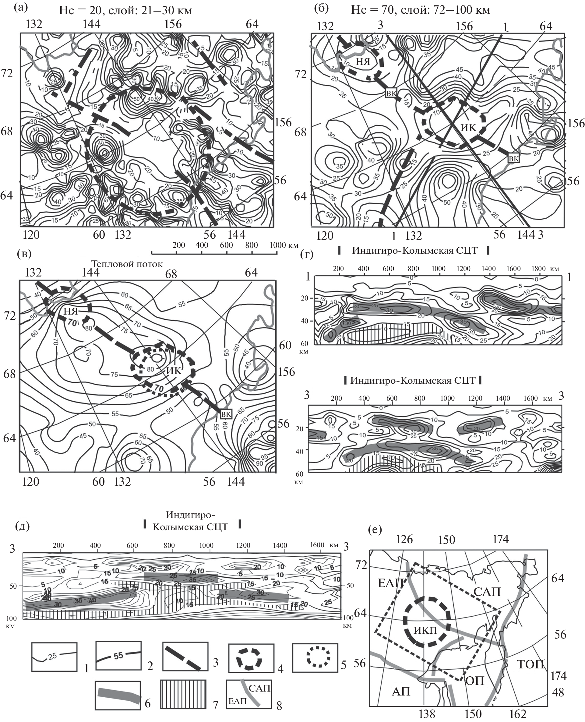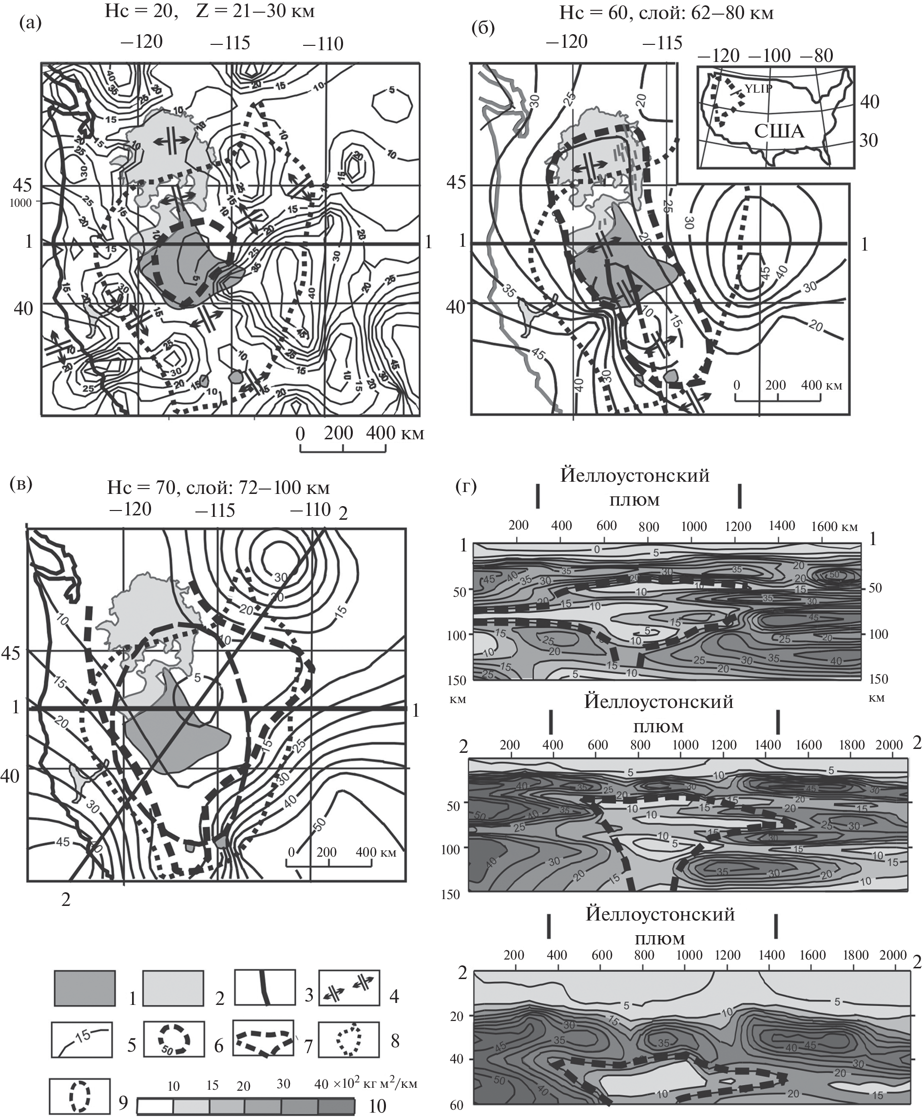 Рассматриваются и сопоставляются с комплексом геолого-геофизических данных 3D распределения плотностной контрастности земной коры и верхней мантии в головах шести плюмов: Йеллоустонского, Эмейшаньского, Катазиатского, Охотоморского, Мая-Селемджинского и Индигиро-Колымского) до глубины 200 км. По полученным данным, астеносферные части плюмов имеют грибовидную форму, а астеносферные магмы растекаются под подошвой литосферы, реже – под подошвой земной коры. На удалении 250–300 км от центрального ствола головы плюмов сужаются до диаметра 200–300 км на глубине 100–120 км. В большинстве рассмотренных плюмов их литосферные и коровые фрагменты выгнуты по направлению к поверхности, В верхних слоях земной коры поднятия иногда осложнены локальными прогибами, что объясняется проседанием сводов структур над магматическими очагами в подкоровом вязком слое и астеносфере. Плюмы часто сопряжены с зонами растяжения литосферы (рифтами), в результате чего в нижних литосферных и коровых срезах плюмов картируются линейные зоны пониженной вязкости. Структурное положение рассмотренных плюмов контролируется границами литосферных плит и крупных сегментов 2‑го порядка. Одинаковая геометрия и реология плюмов, сформировавшихся в разное время (триас–неоген) и в далеко удаленных друг от друга регионах (Северо-Восток России, Приамурье, Северо-Запад США, Южный Китай, Охотское море) свидетельствуют об универсальности тектонических обстановок, способствующих проникновению мантийных струй в верхние тектонические оболочки Земли. Главнейшими из них являются зоны растяжения литосферы, в особенности ‒ участки пересечения разнонаправленных разрывов литосферы.