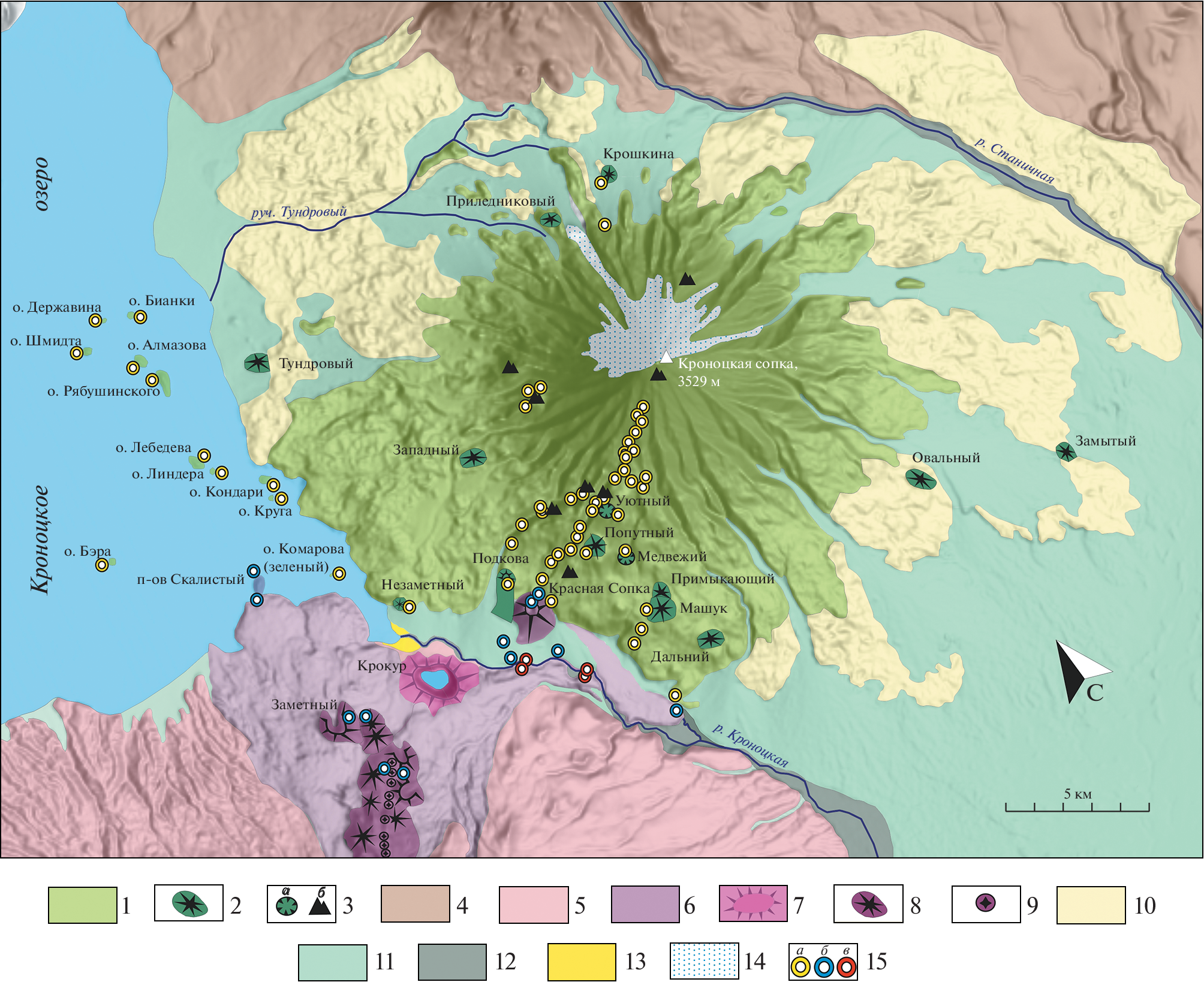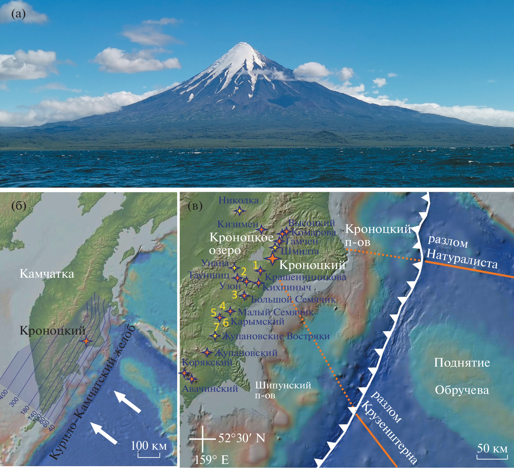 Based on the results of 2020‒2022 field works, this paper presents a characterization of the geological structure and whole rock composition of Kronotsky volcano, one of the poorly studied eruptive centers of the Eastern Volcanic Belt (EVB) of Kamchatka. The volume of the volcanic edifice is estimated at 350 km3, that significantly exceeds the volumes of other stratovolcanoes of the frontal zone of EVB. Rocks of a volcano are presented by low-K, high-Fe tholeiitic basalts and basaltic andesites (SiO2 = 47.04–53.15 wt %; K2O = = 0.24‒0.65 wt %; FeO*/MgO = 1.2‒2.89). The basalts show extremely low contents of silica, potassium, titanium, and phosphorus in comparison with rocks of other frontal volcanoes of Kamchatka. The revealed petrochemical features were used to clarify the belonging of the objects located at the junction of Kronotsky and Krasheninnikov volcanic edifices. The obtained data will serve as the background for further petrological and geochemical studies of the volcano, and also may be used for reconstruction the sequence of volcanic events in this area, including clarification of the history of Kronotsky Lake formation.