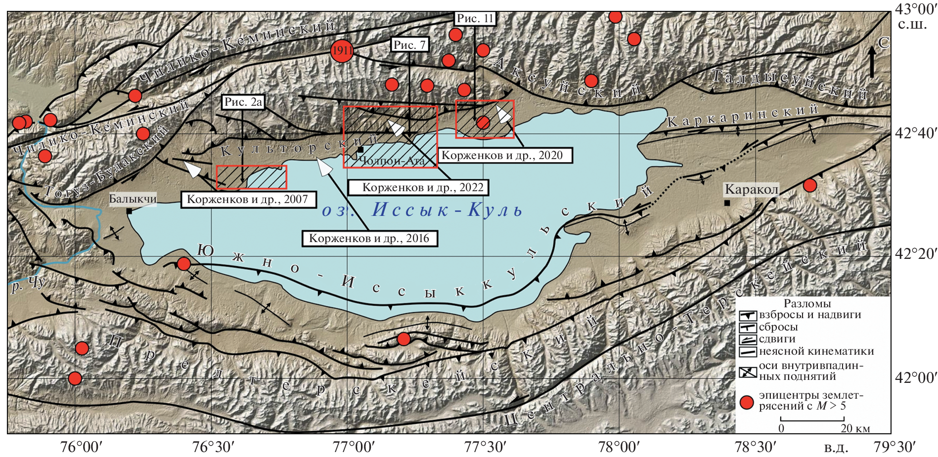 - Deev E., Korzhenkov A., Turova I., Pavlis T.L., Luzhanskii D., Mažeika J., Abdieva S., Yudakhin A. Large ancient earthquakes in the Western Issyk-Kul basin (Kyrgyzstan, Nor-thern Tien Shan) // J. Asian Earth Sci. 2018. V. 166. P. 48–65.