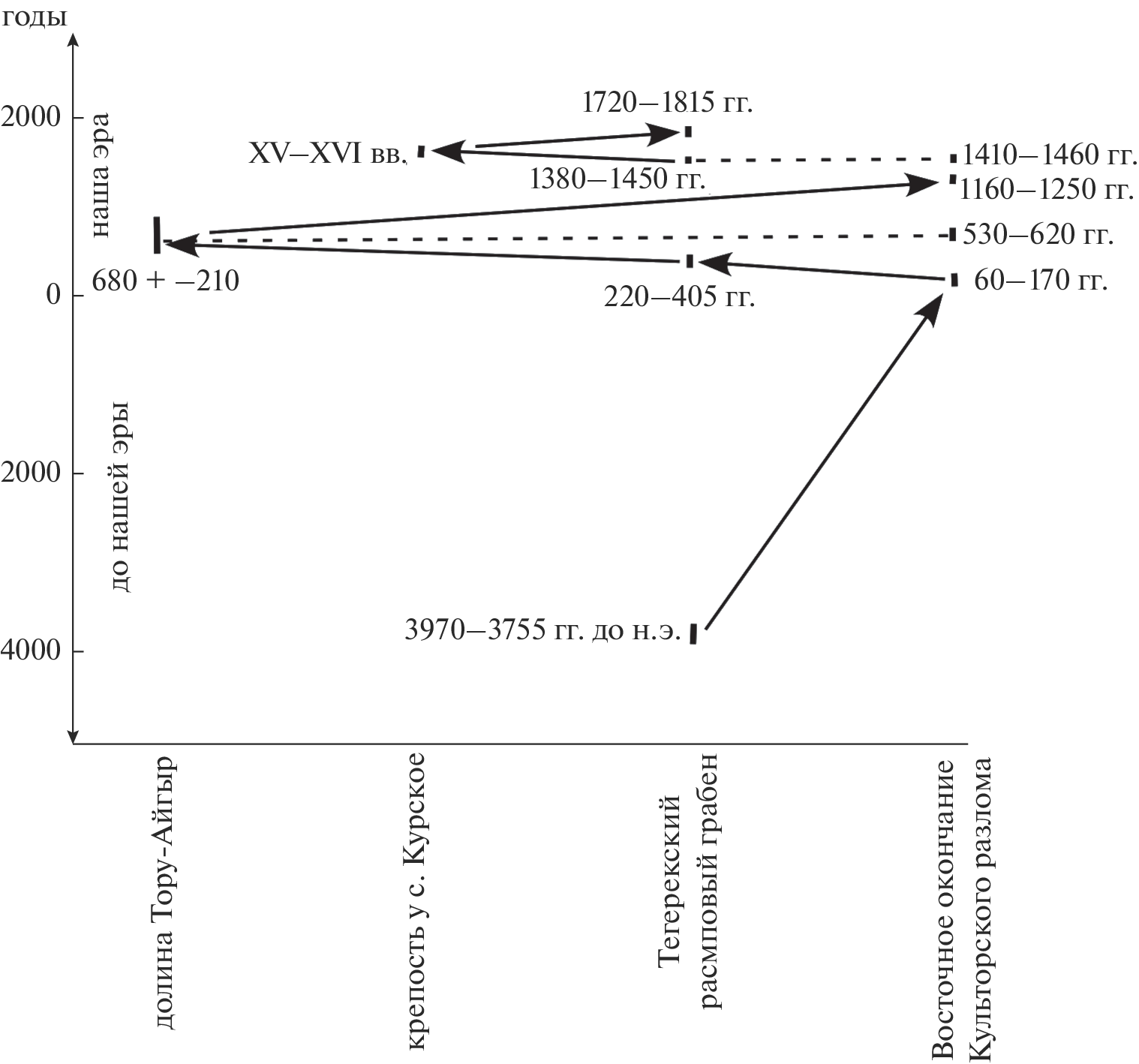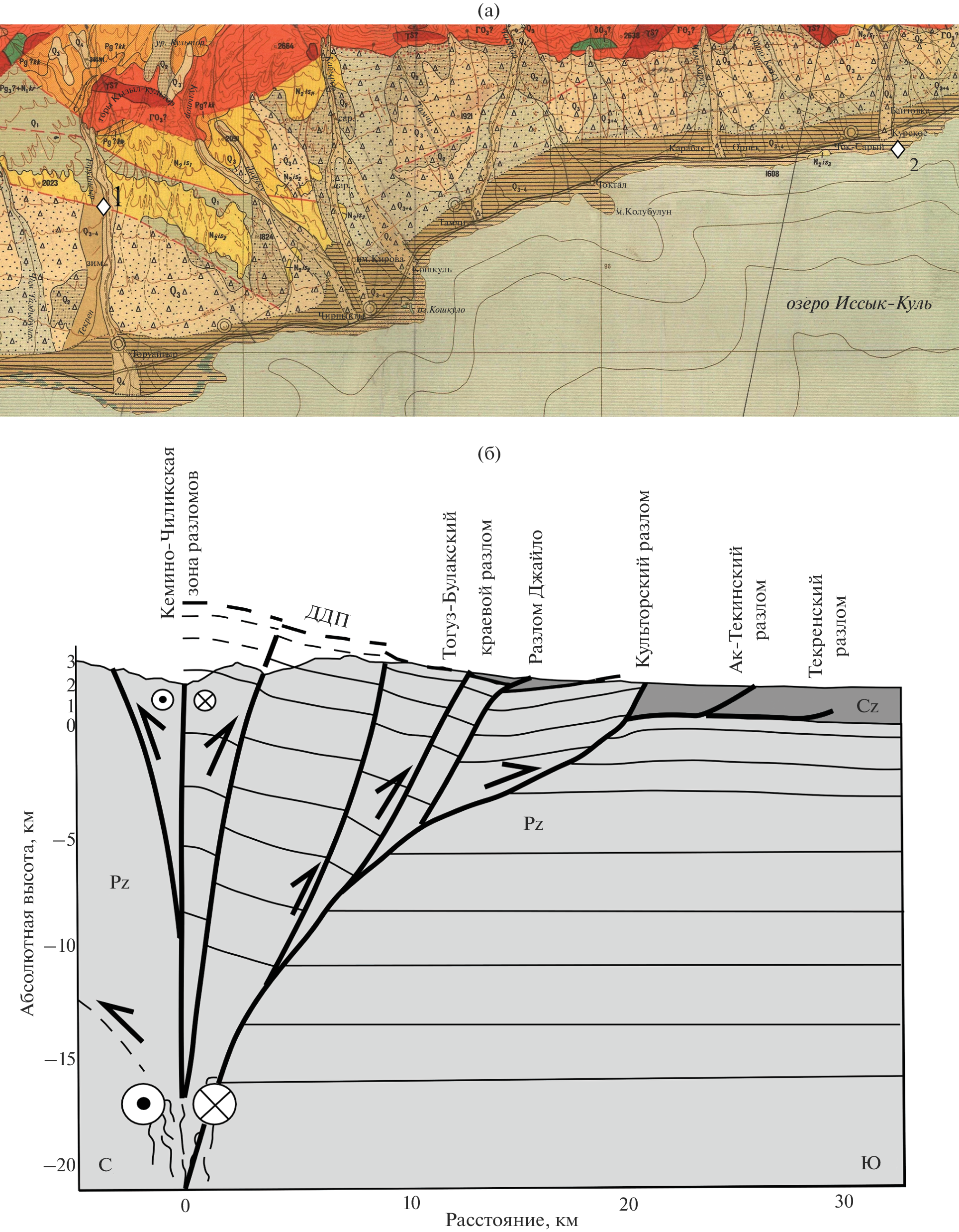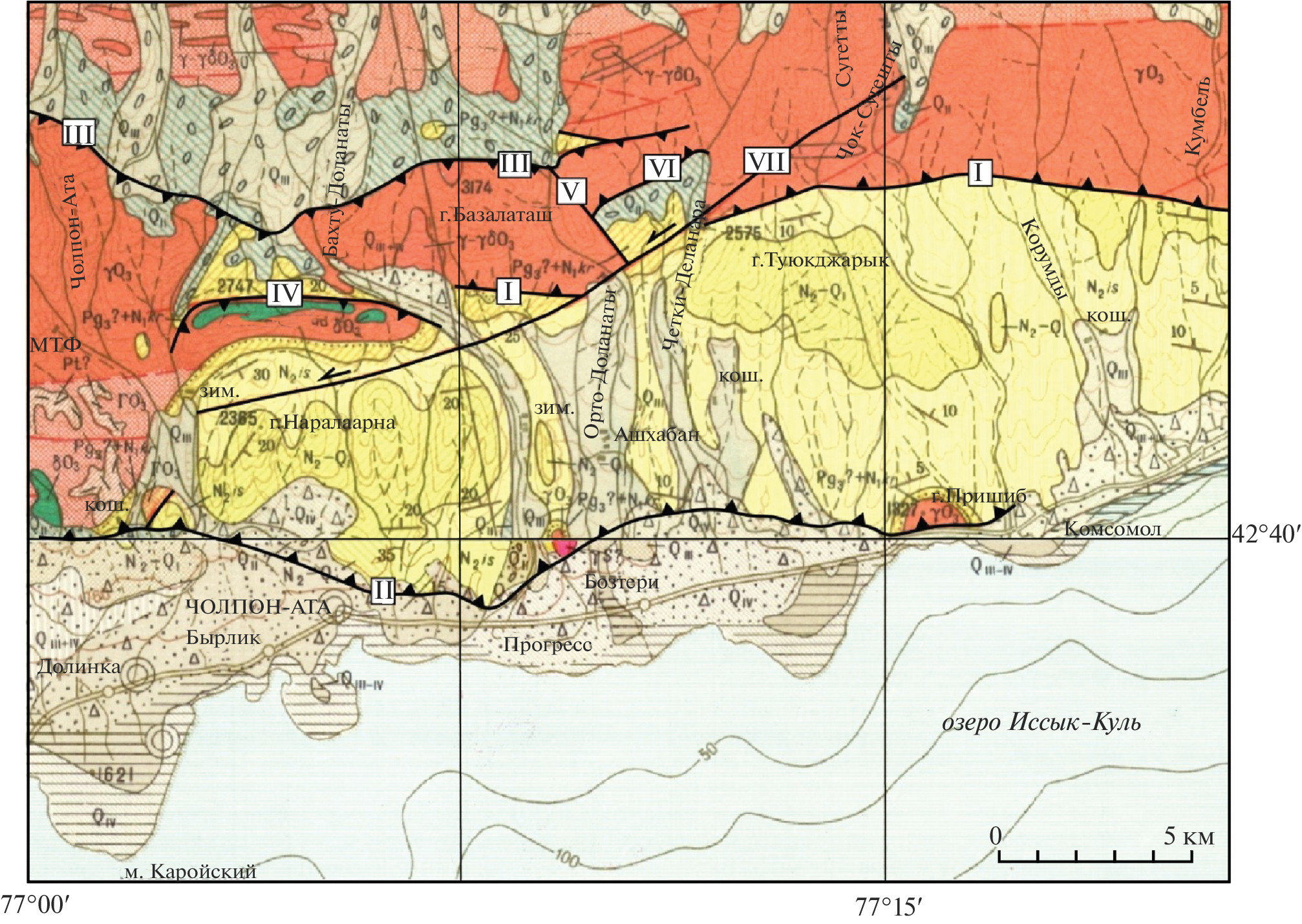 С помощью структурно-геоморфологических и палеосейсмологических методов были исследованы морфоструктуры северного склона хребта Кунгей Ала-Тоо и его южные предгорья (адыры). Анализ данных радиоизотопного датирования (радиоуглеродного и инфракрасного люминесцентного) в пройденных горных выработках показывает латеральную миграцию сильной сейсмической активности вдоль зоны Культорского разлома (Северное Прииссыккулье). Было подтверждено, что современная сильная сейсмическая активность сосредотачивается в адырной зоне и приурочена к адырным разломам. За голоценовое время вдоль разломной зоны произошло, по крайней мере, семь морфогенетических землетрясений. В нашей эре повторяемость морфогенетических землетрясений составляла 200‒300 лет. При этом в VII и XV веках вдоль этого дизъюнктива, по всей видимости, имели место сильнейшие сейсмические катастрофы с М ~ 7.5 (Io = Х баллов), во время которых сейсмические очаги выходили на поверхность, образуя сейсмоуступы длиной до 70‒80 км.