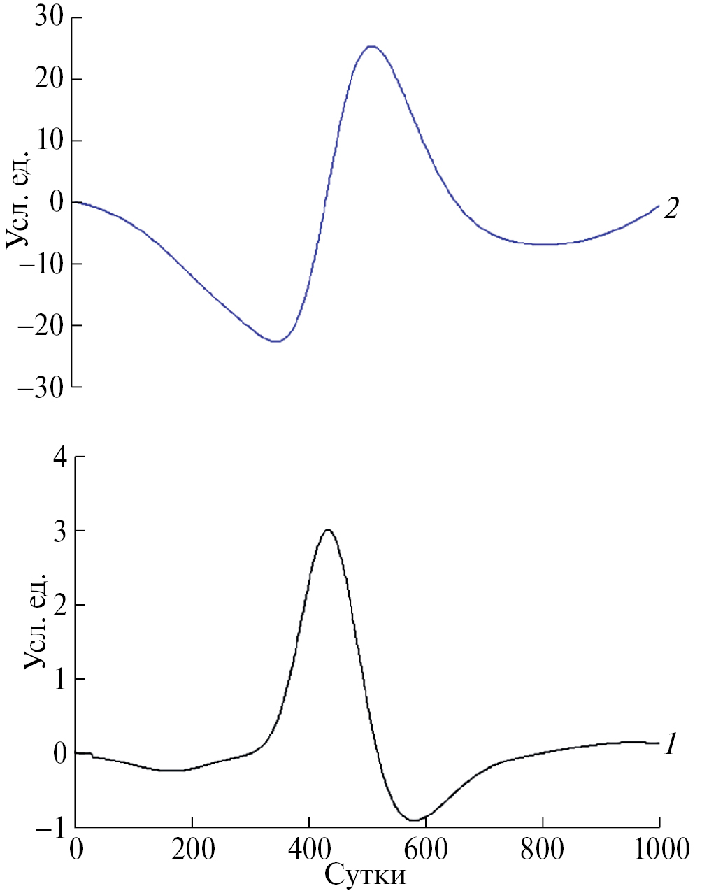 Рис. 2. Сопоставление теоретического земного прилива (1) с его значениями по данным сейсмической станции MAJO (2).