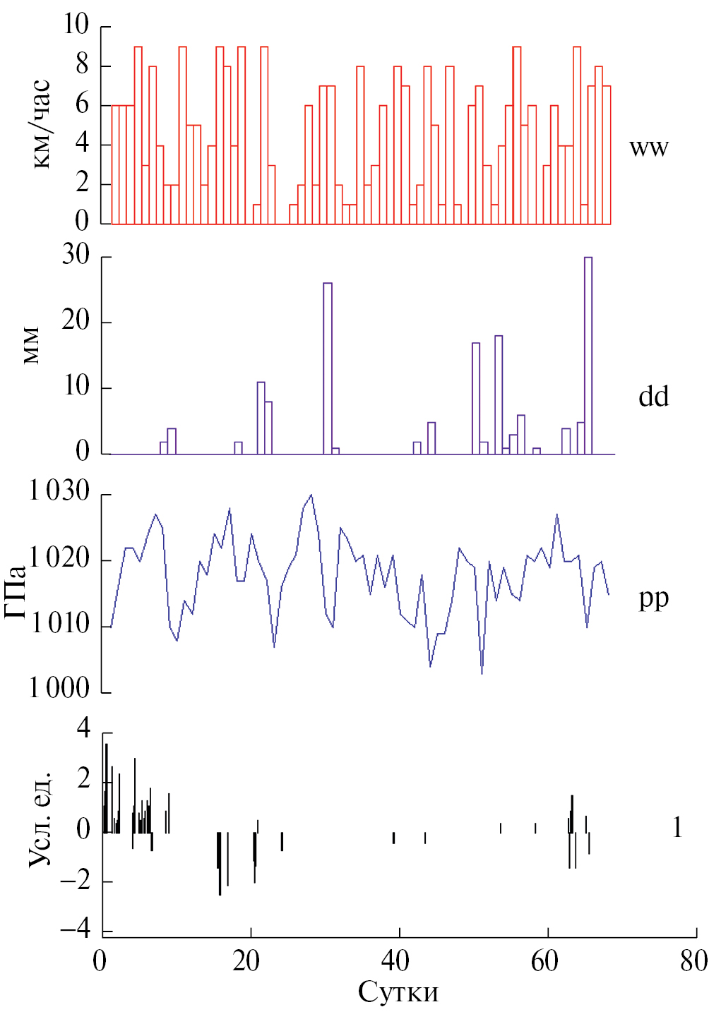 Рис. 8. Сопоставление времен появления сейсмических импульсов на станции MAJO (1) с вариациями атмосферного давления pp, количества выпадения осадков dd и скорости ветра ww на близлежащей метеообсерватории в интервале 1 января – 10 марта 2011 г.