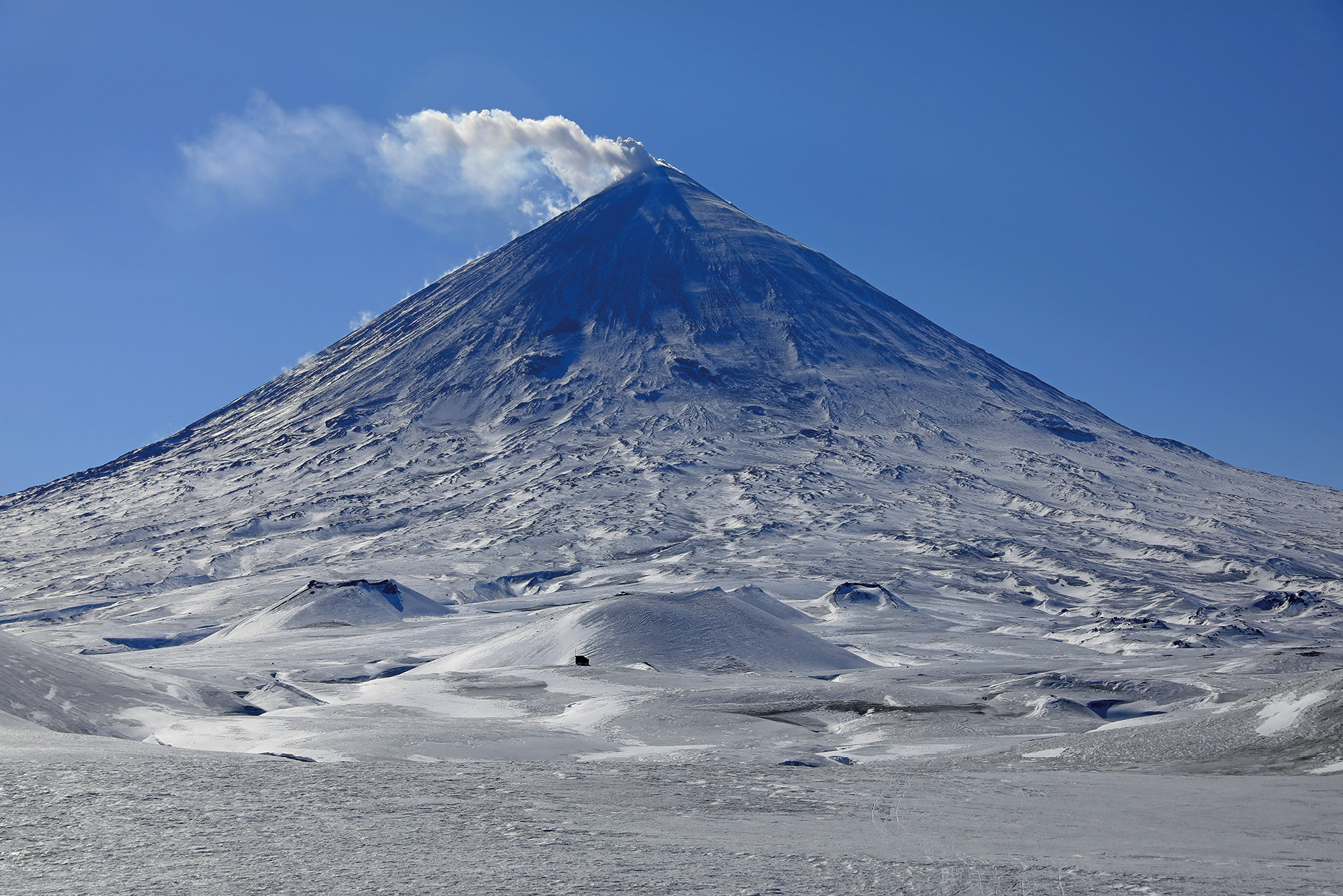 Рис. 1. Общий вид на вулкан Ключевской (вид с северо-востока). На переднем плане видны шлаковые конусы побочных прорывов. Фото Ю.В. Демянчука.