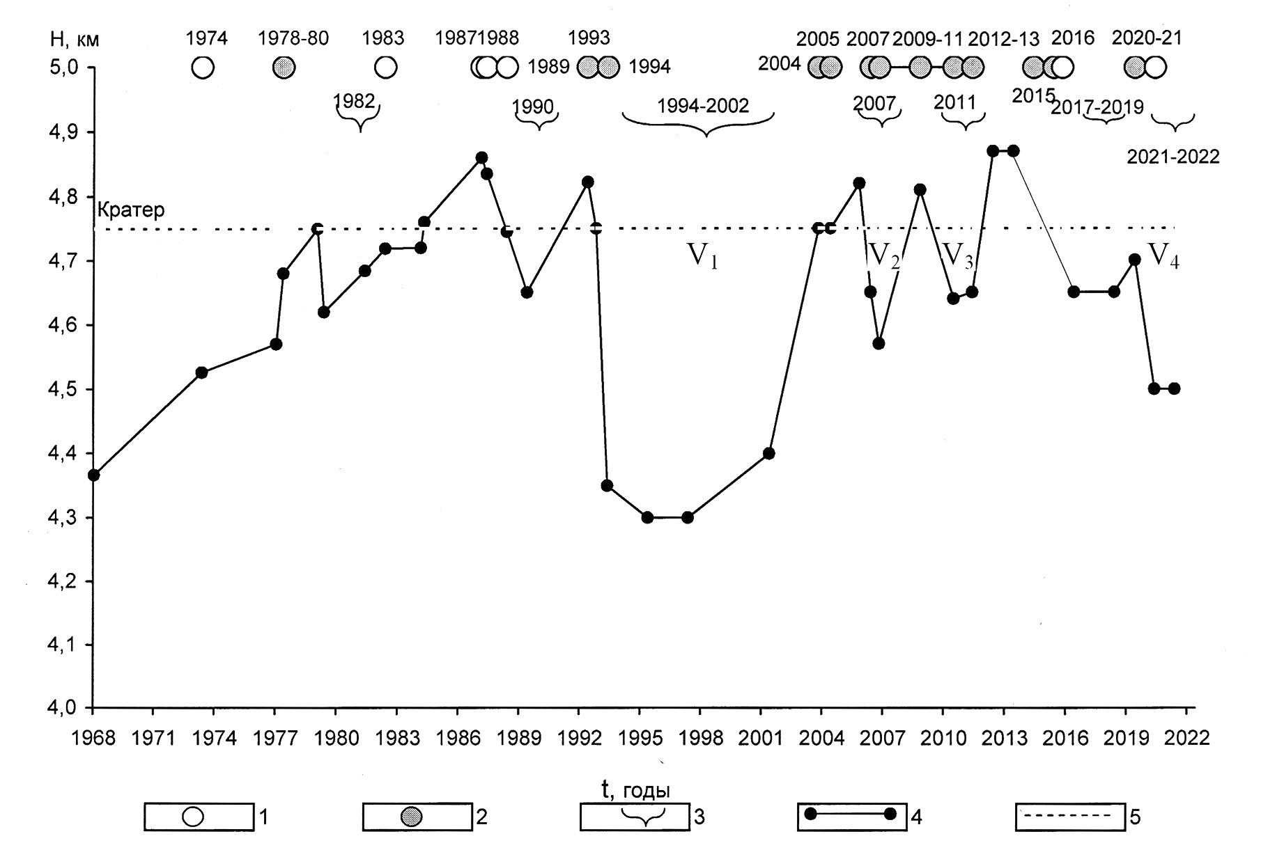 Рис. 2. Изменение высот дна кратера и вершины вулкана Ключевской относительно уровня моря за 1968–2022 гг. 1 – побочное извержение; 2 – вершинное извержение; 3 – провалы вершинного кратера; 4 – высота дна вершинного кратера и его вершины; 5 – уровень лавы при заполненном продуктами извержений кратере и начале излияния лавы на склоны вулкана.