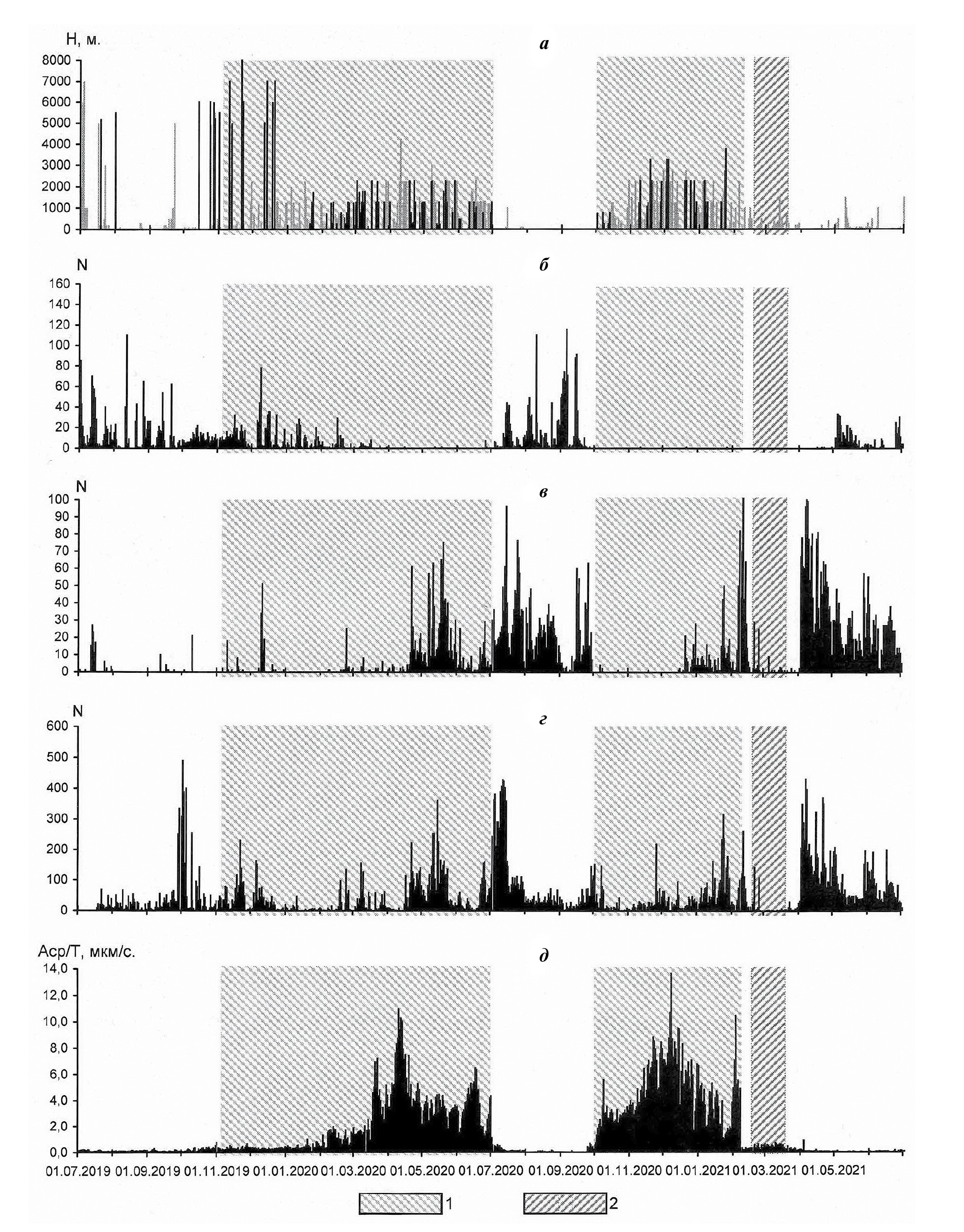 Рис. 4. Суточные характеристики сейсмической и вулканической активности вулкана Ключевской в 2019–2021 гг. а ‒ изменение высоты парогазовых (светлые линии) и газо-пепловых выбросов (темные линии); б – число вулканических землетрясений I‒II типа; в – число вулканических землетрясений II‒III типа; г – число вулканических землетрясений IV типа; д – среднее значение вулканического дрожания Аср/Т (мкм/с). Тип землетрясений дан по классификации П.И. Токарева. Характеристики сейсмической активности приведены по данным КФ ФИЦ ЕГС РАН. 1 – вершинные извержения, 2 – побочные извержения.