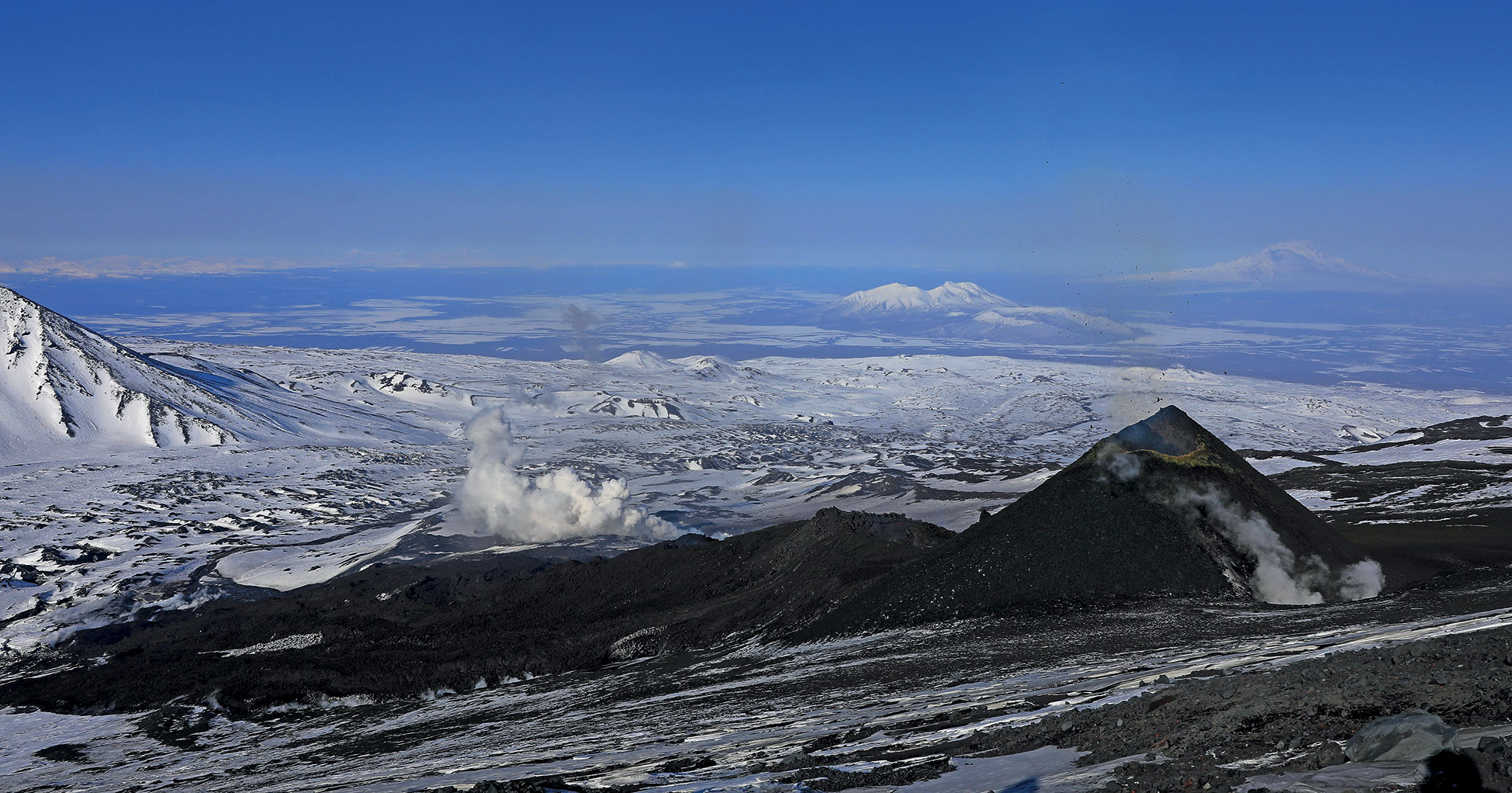 Рис. 6. Побочный прорыв им. Г.С. Горшкова (18.02.2021–20.03.2021 гг.), расположенный на высоте 2800 м на северо-западном склоне вулкана Ключевской. Фото Ю.В. Демянчука.