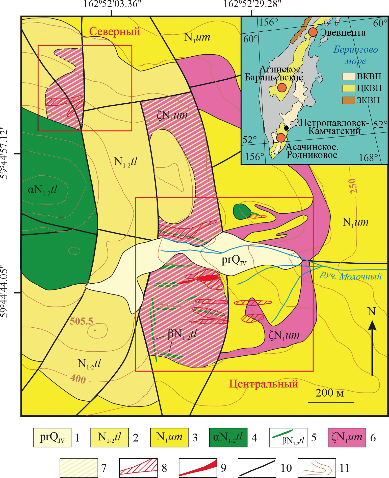 2. Fig. 1. Schematic geological map of the Evevpent ore occurrence. Compiled according to unpublished data of JSC “North-Eastern PGO” with additions and simplifications. 1 – proluvial quaternary deposits (prQIV); 2 – cover formations of the Tolyatovayam volcanic complex (N1-2tl); 3 – cover formations of the Umuvayam volcanic complex (N1um); 4 – subvolcanic andesites of the Tolyatovayam complex (aN1‒2tl); 5 – dikes of basalts of the Tolyatovayam complex (βN1‒2tl); 6 – subvolcanic dacites of the Umuvayama complex (ζN1UM); 7 – mudstone zones; 8 – quartz veining zones; 9 – quartz veins; 10 – faults extending to the daytime surface; 11 – isohypses. In the inset: the location of the ore occurrence of Evevpent and other epithermal deposits, as well as the volcanic belts of Kamchatka Peninsula, according to [Tsukanov, 2015]. VKVP – East Kamchatka volcanic belt; CCVP – Central Kamchatka volcanic belt; WKVP - West Kamchatka volcanic belt.