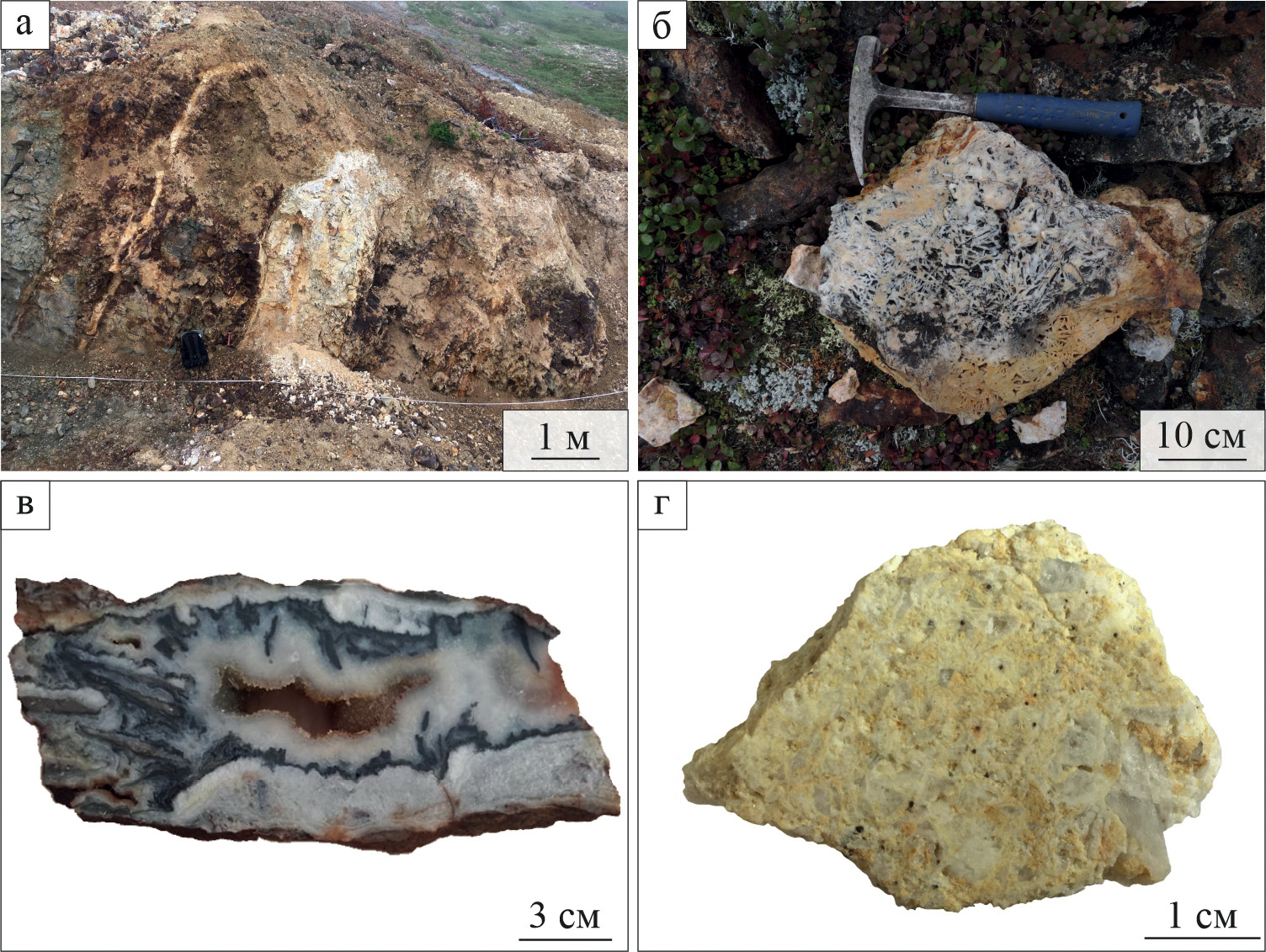 Рис. 2. Адуляр-кварцевая жила в поверхностной горной выработке, участок Центральный (а) и текстуры жил: каркасно-пластинчатая, участок Центральный (б), сочетание колломорфно-полосчатой и друзовой, участок Северный (в) и брекчиевая текстура с тонкой вкрапленностью окисленных сульфидов, участок Центральный (г). Автор фото (2б, 2в) А.С. Московский.