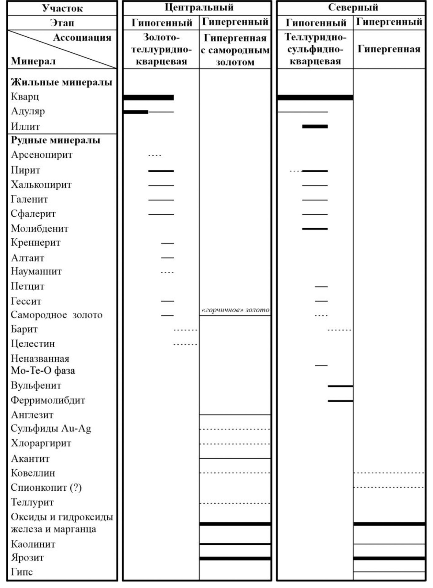 Анализ взаимоотношений между минералами и минеральными парагенезисами, а также наблюдения за текстурными особенностями руд позволяют выделить три минеральные ассоциации, с которыми связана благороднометалльная минерализация: золото-теллуридно-кварцевая, теллуридно-сульфидно-кварцевая и гипергенная с самородным золотом. Формирование ассоциаций происходило в результате двух этапов минералообразования – гипогенного и гипергенного (рис. 3).