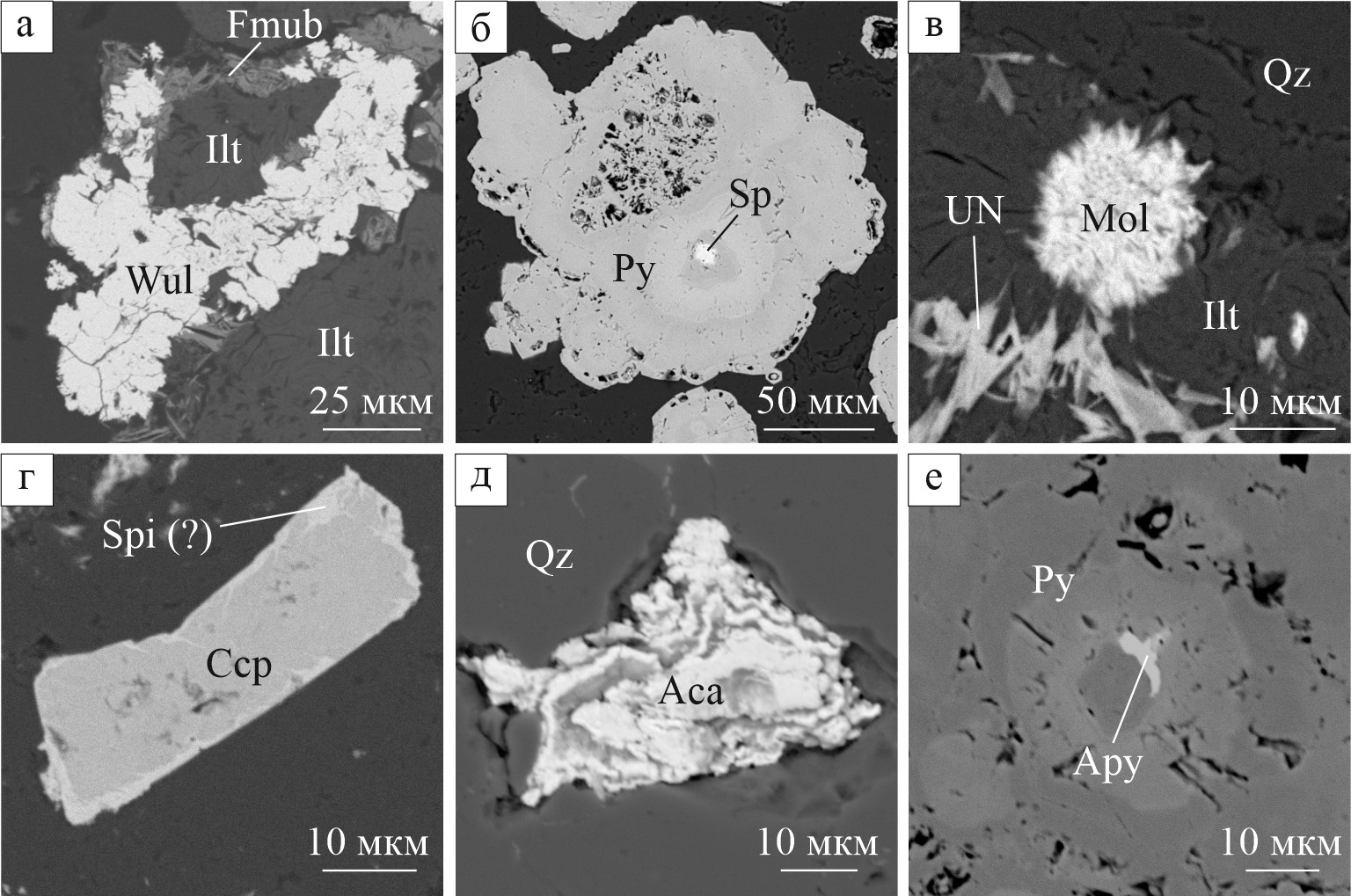 Рис. 4. Взаимоотношения и типоморфные особенности некоторых рудных минералов (изображения в обратно-рассеянных электронах). а – срастания вульфенита (Wul) и ферримолибдита (Fmub) с иллитом (Ilt); б – мышьяксодержащий пирит (Py) с грубой осцилляторной зональностью и включением сфалерита (Sp); в – молибденит (Mol) и неназванная Mo‒Te‒O-фаза (UN) в иллит-кварцевом (Qz) агрегате; г – халькопирит (Ccp) с оторочкой спионкопита (?) (Spi); д – рыхлый, хлопьевидный акантит (Aca) в кварце; е – включение арсенопирита (Apy) в мышьяксодержащем пирите.